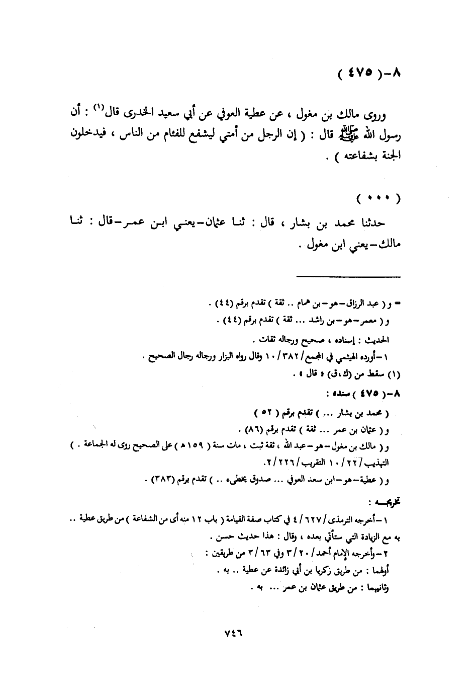 حَدَّثَنَا مُحَمَّدُ بْنُ بَشَّارٍ، قَالَ: ثَنَا عُثْمَانُ يَعْنِي ابْنَ عُمَرَ قَالَ: ثَنَا مَالِكٌ يَعْنِي ابْنَ مِغْوَلٍ -[747]- وَرَوَاهُ يَعْقُوبُ بْنُ إِسْحَاقَ الْحَضْرَمِيُّ، وَزَادَ فِيهِ زِيَادَةً حَدَّثَنَاهُ يَحْيَى بْنُ حَكِيمٍ، ثَنَا يَعْقُوبُ بْنُ إِسْحَاقَ الْحَضْرَمِيُّ، قَالَ: ثَنَا مَالِكُ بْنُ مِغْوَلٍ، عَنْ عَطِيَّةَ، عَنْ أَبِي سَعِيدٍ الْخُدْرِيِّ، قَالَ: قَالَ رَسُولُ اللَّهِ صَلَّى اللهُ عَلَيْهِ وَسَلَّمَ: «§إِنَّ فِي أُمَّتِي لَرِجَالًا يَشْفَعُ الرَّجُلُ مِنْهُمْ فِي الْفِئَامِ مِنَ النَّاسِ، وَيَدْخُلُونَ الْجَنَّةَ بِشَفَاعَتِهِ وَيُشَفَّعُ الرَّجُلُ مِنْهُمْ لِلرِّجَالِ مِنْ أَهْلِ بَيْتِهِ، فَيَدْخُلُونَ الْجَنَّةَ بِشَفَاعَتِهِ»