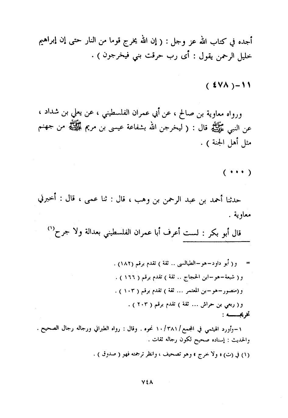 وَرَوَاهُ مُعَاوِيَةُ بْنُ صَالِحٍ، عَنْ أَبِي عِمْرَانَ الْفِلَسْطِينِيِّ، عَنْ يَعْلَى بْنِ شَدَّادٍ، عَنِ النَّبِيِّ صَلَّى اللهُ عَلَيْهِ وَسَلَّمَ قَالَ: «§لَيُخْرِجَنَّ اللَّهُ بِشَفَاعَةِ عِيسَى ابْنِ مَرْيَمَ صَلَّى اللهُ عَلَيْهِ وَسَلَّمَ مِنْ جَهَنَّمَ مِثْلَ أَهْلِ الْجَنَّةِ» حَدَّثَنَا أَحْمَدُ بْنُ عَبْدِ الرَّحْمَنِ بْنِ وَهْبٍ، قَالَ: ثَنَا عَمِّي، قَالَ: أَخْبَرَنِي مُعَاوِيَةُ قَالَ أَبُو بَكْرٍ: لَسْتُ أَعْرِفُ أَبَا عِمْرَانَ الْفِلَسْطِينِيَّ بِعَدَالَةٍ وَلَا جَرْحٍ