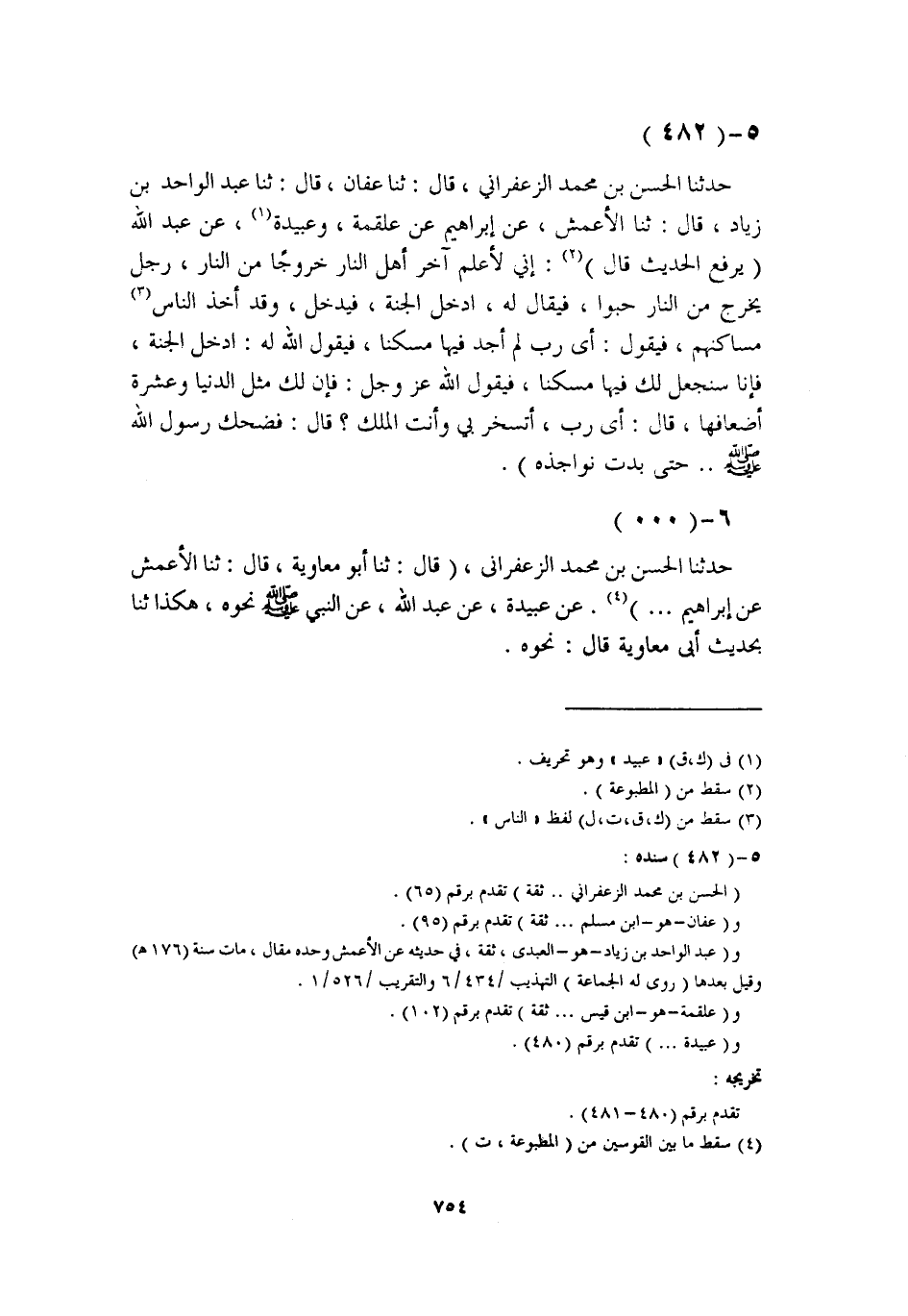 حَدَّثَنَا الْحَسَنُ بْنُ مُحَمَّدٍ الزَّعْفَرَانِيُّ، قَالَ: ثَنَا عَفَّانُ، قَالَ: ثَنَا عَبْدُ الْوَاحِدِ بْنُ زِيَادٍ، قَالَ: ثَنَا الْأَعْمَشُ، عَنْ إِبْرَاهِيمَ، عَنْ عَلْقَمَةَ، وَعُبَيْدَةَ، عَنْ عَبْدِ اللَّهِ، - يَرْفَعُ الْحَدِيثَ قَالَ -: " §إِنِّي لَأَعْلَمُ آخِرَ أَهْلِ النَّارِ خُرُوجًا مِنَ النَّارِ، رَجُلٌ يَخْرُجُ مِنَ النَّارِ حَبْوًا، فَيُقَالُ لَهُ: ادْخُلِ الْجَنَّةَ، فَيَدْخُلُ وَقَدْ أَخَذَ النَّاسُ مَسَاكِنَهُمْ، فَيَقُولُ: أَيْ رَبِّ، لَمْ أَجِدْ فِيهَا مَسْكَنًا، فَيَقُولُ اللَّهُ لَهُ: ادْخُلِ الْجَنَّةَ، فَإِنَّا سَنَجْعَلُ لَكَ فِيهَا مَسْكَنًا، فَيَقُولُ اللَّهُ عَزَّ وَجَلَّ: فَإِنَّ لَكَ مِثْلُ الدُّنْيَا وَعَشَرَةُ أَضْعَافِهَا، قَالَ: أَيْ رَبِّ، أَتَسْخَرُ بِي وَأَنْتَ الْمَلِكُ؟ " قَالَ: فَضَحِكَ رَسُولُ اللَّهِ صَلَّى اللهُ عَلَيْهِ وَسَلَّمَ حَتَّى بَدَتْ نَوَاجِذُهُ حَدَّثَنَا الْحَسَنُ بْنُ مُحَمَّدٍ الزَّعْفَرَانِيُّ، قَالَ: ثَنَا أَبُو مُعَاوِيَةَ، قَالَ: ثَنَا الْأَعْمَشُ، عَنْ إِبْرَاهِيمَ، عَنْ عُبَيْدَةَ، عَنْ عَبْدِ اللَّهِ، عَنِ النَّبِيِّ صَلَّى اللهُ عَلَيْهِ وَسَلَّمَ نَحْوَهُ، هَكَذَا ثَنَا بِحَدِيثِ أَبِي مُعَاوِيَةَ قَالَ نَحْوَهُ