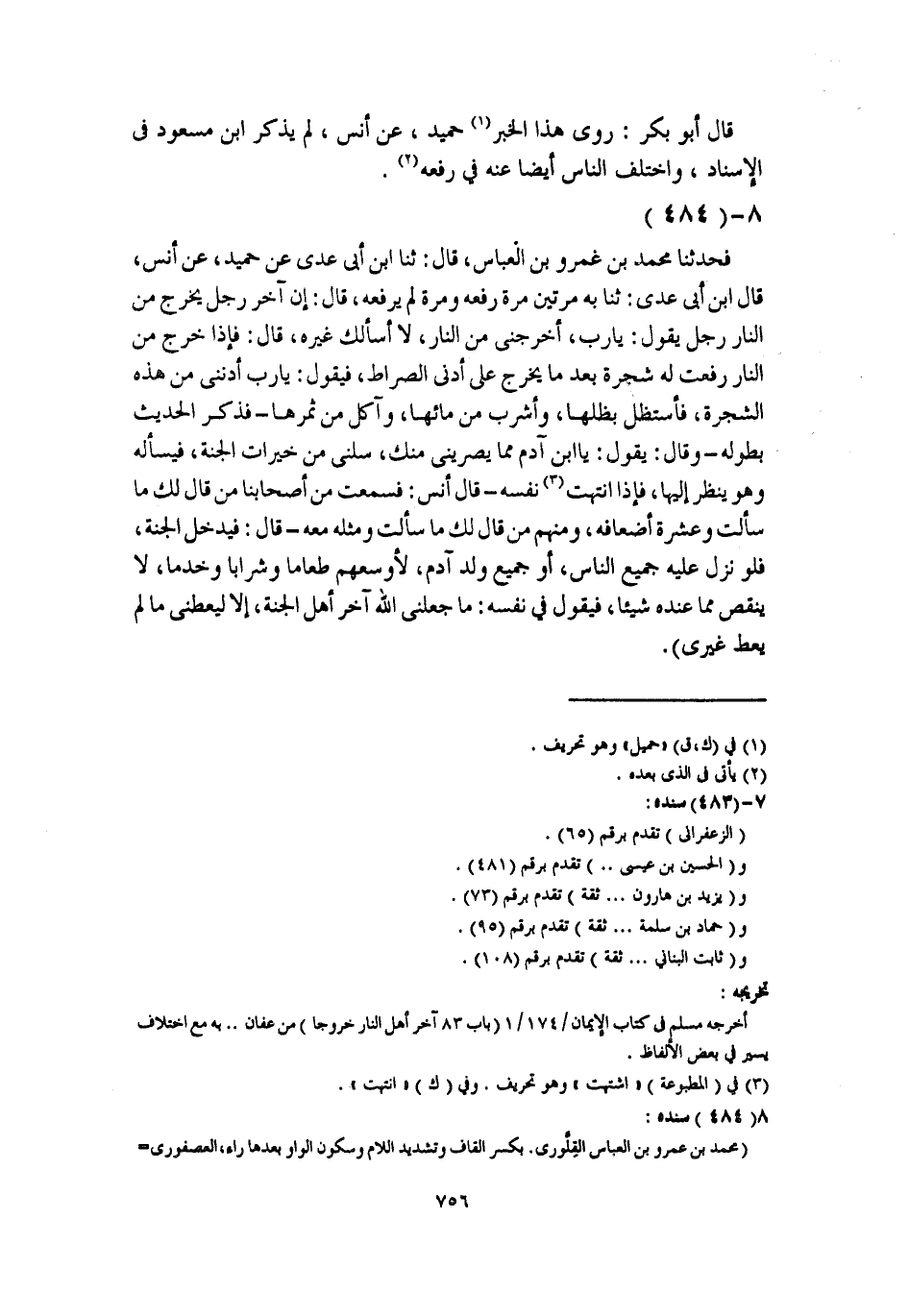 فَحَدَّثَنَا مُحَمَّدُ بْنُ عَمْرِو بْنِ الْعَبَّاسِ، قَالَ: ثَنَا ابْنُ أَبِي عَدِيٍّ، عَنْ حُمَيْدٍ، عَنْ أَنَسٍ، قَالَ ابْنُ أَبِي عَدِيٍّ: ثَنَا بِهِ، مَرَّتَيْنِ مَرَّةً رَفَعَهُ، وَمَرَّةً لَمْ يَرْفَعْهُ، قَالَ: " إِنَّ §آخِرَ رَجُلٍ يَخْرُجُ مِنَ النَّارِ رَجُلٌ يَقُولُ: يَا رَبِّ، أَخْرِجْنِي مِنَ النَّارِ، لَا أَسْأَلُكَ غَيْرَهُ، قَالَ: فَإِذَا خَرَجَ مِنَ النَّارِ رُفِعَتْ لَهُ شَجَرَةٌ بَعْدَمَا يَخْرُجُ عَلَى أَدْنَى الصِّرَاطِ، فَيَقُولُ: يَا رَبِّ أَدْنِنِي مِنْ هَذِهِ الشَّجَرَةِ، فَأَسْتَظِلَّ بِظِلِّهَا، وَأَشْرَبَ مِنْ مَائِهَا، وَآكُلَ مِنْ ثَمَرِهَا " فَذَكَرَ الْحَدِيثَ بِطُولِهِ وَقَالَ: " يَقُولُ: يَا ابْنَ آدَمَ مِمَّا يَصْرِينِي مِنْكَ، سَلْنِي مِنْ خَيْرَاتِ الْجَنَّةِ، فَيَسْأَلُهُ وَهُوَ يَنْظُرُ إِلَيْهَا، فَإِذَا انْتَهَتْ نَفْسُهُ " قَالَ أَنَسٌ: فَسَمِعْتُ مِنَ أَصْحَابِنَا مَنْ قَالَ: «لَكَ مَا سَأَلْتَ وَعَشَرَةُ أَضْعَافِهِ» ، وَمِنْهُمْ مَنْ قَالَ: «لَكَ مَا سَأَلْتَ وَمِثْلُهُ مَعَهُ» قَالَ: فَيَدْخُلُ الْجَنَّةَ، فَلَوْ نَزَلَ عَلَيْهِ جَمِيعُ النَّاسِ، أَوْ جَمِيعُ وَلَدِ آدَمَ، لَأَوْسَعَهُمْ طَعَامًا وَشَرَابًا وَخَدَمًا، لَا يَنْقُصُ مِمَّا عِنْدَهُ شَيْئًا، فَيَقُولُ فِي نَفْسِهِ: مَا جَعَلَنِي اللَّهُ آخِرَ أَهْلِ الْجَنَّةِ، إِلَّا لِيُعْطِيَنِي مَا لَمْ يُعْطِ غَيْرِي " -[757]- حَدَّثَنَا مُحَمَّدُ بْنُ عَبْدِ الْأَعْلَى الصَّنْعَانِيُّ، قَالَ: ثَنَا الْمُعْتَمِرُ، قَالَ: سَمِعْتُ حُمَيْدًا، يُحَدِّثُ عَنْ أَنَسٍ أَنَّ آخِرَ، مَنْ يَخْرُجُ مِنَ النَّارِ، وَآخَرَ مَنْ يَدْخُلُ الْجَنَّةَ، رَجُلٌ يَقُولُ لَهُ رَبُّهُ عَزَّ وَجَلَّ: يَا ابْنَ آدَمَ، مَا تَسْأَلُنِي؟ فَذَكَرَ الصَّنْعَانِيُّ الْحَدِيثَ بِطُولِهِ، قَالَ: " فَلَوْ نَزَلَ بِهِ جَمِيعُ أَهْلِ الْأَرْضِ، أَوْ قَالَ: جَمِيعُ بَنِي آدَمَ، لَأَوْسَعَهُمْ طَعَامًا وَشَرَابًا، وَخَدَمًا لَا يَنْقُصُ مِمَّا عِنْدَهُ شَيْئًا