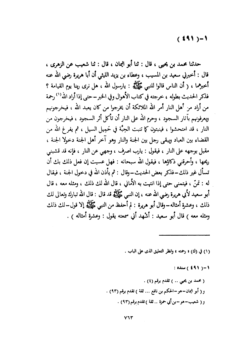 حَدَّثَنَا مُحَمَّدُ بْنُ يَحْيَى، قَالَ: ثَنَا أَبُو الْيَمَانِ، قَالَ: ثَنَا شُعَيْبٌ، عَنِ الزُّهْرِيِّ، قَالَ: أَخْبَرَنِي سَعِيدُ بْنُ الْمُسَيِّبِ، وَعَطَاءُ بْنُ يَزِيدَ اللَّيْثِيُّ، أَنَّ أَبَا هُرَيْرَةَ، رَضِيَ اللَّهُ عَنْهُ أَخْبَرَهُمَا، أَنَّ النَّاسَ قَالُوا لِلنَّبِيِّ صَلَّى اللهُ عَلَيْهِ وَسَلَّمَ: يَا رَسُولَ اللَّهِ، هَلْ نَرَى رَبَّنَا يَوْمَ الْقِيَامَةِ؟ فَذَكَرَ الْحَدِيثَ بِطُولِهِ خَرَّجْتُهُ فِي كِتَابِ الْأَهْوَالِ وَفِي الْخَبَرِ: " حَتَّى إِذَا أَرَادَ اللَّهُ رَحْمَةَ مَنْ أَرَادَ مِنْ أَهْلِ النَّارِ أَمَرَ اللَّهُ الْمَلَائِكَةَ أَنْ يُخْرِجُوا مَنْ كَانَ يَعْبُدُ اللَّهَ، فَيُخْرِجُونَهُمْ وَيَعْرِفُونَهُمْ بِآثَارِ السُّجُودِ، §وَحَرَّمَ اللَّهُ عَلَى النَّارِ أَنْ تَأْكُلَ أَثَرَ السُّجُودِ، فَيُخْرَجُونَ مِنَ النَّارِ، قَدِ امْتُحِشُوا، فَيَنْبُتُونَ كَمَا تَنْبُتُ الْحِبَّةُ فِي حَمِيلِ السَّيْلِ، ثُمَّ يَفْرُغُ اللَّهُ مِنَ الْقَضَاءِ بَيْنَ الْعِبَادِ وَيَبْقَى رَجُلٌ بَيْنَ الْجَنَّةِ وَالنَّارِ وَهُوَ آخِرُ أَهْلِ الْجَنَّةِ دُخُولًا الْجَنَّةَ، مُقْبِلٌ بِوَجْهِهِ عَلَى النَّارِ، فَيَقُولُ: يَا رَبِّ اصْرِفْ، وَجْهِي عَنِ النَّارِ، فَإِنَّهُ قَدْ قَشَبَنِي رِيحُهَا، وَأَحْرَقَنِي ذَكَاؤُهَا، فَيَقُولُ اللَّهُ سُبْحَانَهُ: فَهَلْ عَسَيْتَ إِنْ فُعِلَ ذَلِكَ بِكَ أَنْ تَسْأَلَ غَيْرَ ذَلِكَ " فَذَكَرَ بَعْضَ الْحَدِيثِ وَقَالَ: " ثُمَّ يَأْذَنُ اللَّهُ فِي دُخُولِ الْجَنَّةِ، فَيُقَالُ لَهُ: تَمَنَّ، فَيَتَمَنَّى حَتَّى إِذَا انْتَهَتْ بِهِ الْأَمَانِيُّ، قَالَ اللَّهُ لَكَ ذَلِكَ، وَمِثْلُهُ مَعَهُ "، قَالَ أَبُو سَعِيدٍ لِأَبِي هُرَيْرَةَ رَضِيَ اللَّهُ عَنْهُ، إِنَّ النَّبِيَّ صَلَّى اللهُ عَلَيْهِ وَسَلَّمَ قَدْ قَالَ: «قَالَ اللَّهُ تَبَارَكَ وَتَعَالَى لَكَ ذَلِكَ وَعَشَرَةُ أَمْثَالِهِ» ، وَقَالَ أَبُو هُرَيْرَةَ: لَمْ أَحْفَظْ مِنَ النَّبِيِّ صَلَّى اللهُ عَلَيْهِ وَسَلَّمَ إِلَّا قَوْلَهُ: «لَكَ ذَلِكَ وَمِثْلُهُ مَعَهُ» قَالَ أَبُو سَعِيدٍ: أَشْهَدُ أَنِّي سَمِعْتُهُ يَقُولُ: «وَعَشَرَةُ أَمْثَالِهِ» -[764]- حَدَّثَنَا مُحَمَّدُ بْنُ يَحْيَى، قَالَ: ثَنَا عَبْدُ الرَّزَّاقِ، قَالَ: أَخْبَرَنَا مَعْمَرٌ، عَنِ الزُّهْرِيِّ، عَنْ عَطَاءِ بْنِ يَزِيدَ اللَّيْثِيِّ، عَنْ أَبِي هُرَيْرَةَ رَضِيَ اللَّهُ عَنْهُ وَثَنَا مُحَمَّدٌ، قَالَ: ثَنَا سُلَيْمَانُ بْنُ دَاوُدَ الْهَاشِمِيُّ، قَالَ: أَخْبَرَنَا إِبْرَاهِيمُ بْنُ سَعْدٍ -[765]-، عَنِ ابْنِ شِهَابٍ، عَنْ عَطَاءِ بْنِ يَزِيدَ اللَّيْثِيِّ، أَنَّ أَبَا هُرَيْرَةَ، رَضِيَ اللَّهُ عَنْهُ، أَخْبَرَهُ، قَالَ: قَالَ النَّاسُ يَا رَسُولَ اللَّهِ، وَقَالَ الْهَاشِمِيُّ: إِنَّ النَّاسَ قَالُوا: يَا رَسُولَ اللَّهِ، قَالَ مُحَمَّدُ بْنُ يَحْيَى، وَسَاقَا جَمِيعًا الْحَدِيثَ بِهَذَا الْخَبَرِ، غَيْرَ أَنَّهُمَا رُبَّمَا اخْتَلَفَا فِي اللَّفْظَةِ، وَالشَّيْءُ وَالْمَعْنَى وَاحِدٌ