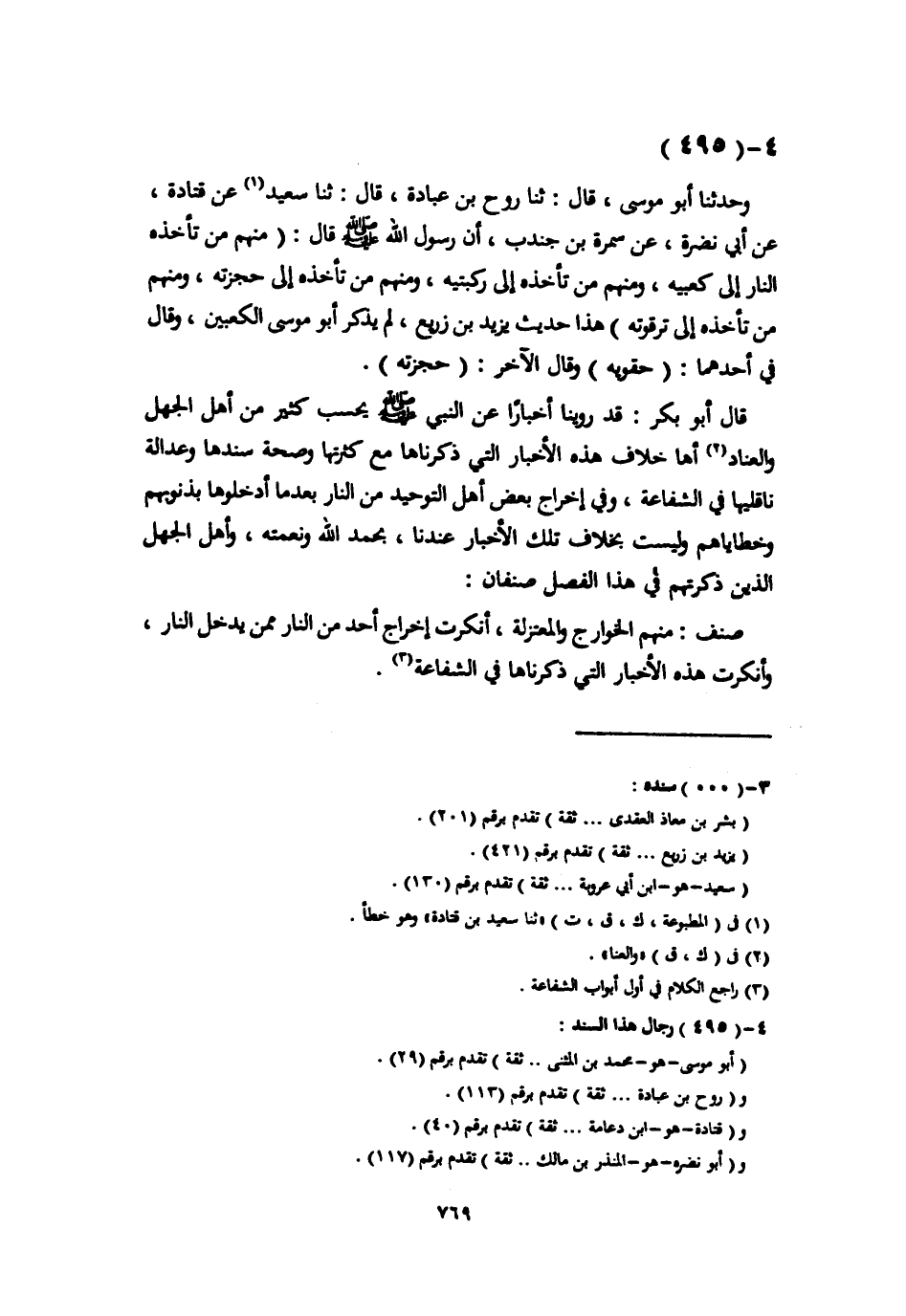 وَحَدَّثَنَا أَبُو مُوسَى، قَالَ: ثَنَا رَوْحُ بْنُ عُبَادَةَ، قَالَ: ثَنَا سَعِيدٌ، عَنْ قَتَادَةَ، عَنْ أَبِي نَضْرَةَ، عَنْ سَمُرَةَ بْنِ جُنْدُبٍ، أَنَّ رَسُولَ اللَّهِ صَلَّى اللهُ عَلَيْهِ وَسَلَّمَ قَالَ: «§مِنْهُمْ مَنْ تَأْخُذُهُ النَّارُ إِلَى كَعْبَيْهِ، وَمِنْهُمْ مَنْ تَأْخُذُهُ إِلَى رُكْبَتَيْهِ، وَمِنْهُمْ مَنْ تَأْخُذُهُ إِلَى حُجْزَتِهِ، وَمِنْهُمْ مَنْ تَأْخُذُهُ إِلَى تَرْقُوَتِهِ» هَذَا حَدِيثُ يَزِيدَ بْنِ زُرَيْعٍ، لَمْ يَذْكُرْ أَبُو مُوسَى الْكَعْبَيْنِ، وَقَالَ فِي أَحَدِهِمَا: حِقْوَيْهِ وَقَالَ الْآخَرُ: حُجْزَتِهِ قَالَ أَبُو بَكْرٍ: قَدْ رُوِّينَا أَخْبَارًا عَنِ النَّبِيِّ صَلَّى اللهُ عَلَيْهِ وَسَلَّمَ يَحْسِبُ كَثِيرٌ مِنْ أَهْلِ الْجَهْلِ وَالْعِنَادِ أَنَّهَا خِلَافُ هَذِهِ الْأَخْبَارَ الَّتِي ذَكَرْنَاهَا مَعَ كَثْرَتِهَا وَصِحَّةِ سَنَدِهَا وَعَدَالَةِ نَاقِلِيهَا فِي الشَّفَاعَةِ، وَفِي إِخْرَاجِ بَعْضِ أَهْلِ التَّوْحِيدِ مِنَ النَّارِ بَعْدَمَا أُدْخِلُوهَا بِذُنُوبِهِمْ وَخَطَايَاهُمْ، وَلَيْسَتْ بِخِلَافِ تِلْكَ الْأَخْبَارِ عِنْدَنَا، بِحَمْدِ اللَّهِ وَنِعْمَتِهِ، وَأَهْلُ الْجَهْلِ الَّذِينَ ذَكَرْتُهُمْ فِي هَذَا الْفَصْلِ صِنْفَانِ: صِنْفٌ: مِنْهُمُ الْخَوَارِجُ وَالْمُعْتَزِلَةِ، أَنْكَرَتْ إِخْرَاجَ أَحَدٍ مِنَ النَّارِ مِمَّنْ يَدْخُلُ النَّارَ، وَأَنْكَرَتْ هَذِهِ الْأَخْبَارَ الَّتِي ذَكَرْنَاهَا فِي الشَّفَاعَةِ -[770]-، الصِّنْفُ الثَّانِي: الْغَالِيَةُ مِنَ الْمُرْجِئَةِ الَّتِي تَزْعُمُ أَنَّ النَّارَ حُرِّمَتْ عَلَى مَنْ قَالَ لَا إِلَهَ إِلَّا اللَّهُ، تَتَأَوَّلُ هَذِهِ الْأَخْبَارَ الَّتِي رُوِيَتْ عَنِ النَّبِيِّ صَلَّى اللهُ عَلَيْهِ وَسَلَّمَ فِي هَذِهِ اللَّفْظَةِ عَلَى خِلَافِ تَأْوِيلِهَا فَأَوَّلُ مَا نَبْدَأُ بِذِكْرِ الْأَخْبَارِ، بِأَسَانِيدِهَا وَأَلْفَاظِ مُتُونِهَا ثُمَّ نُبَيِّنُ مَعَانِيهَا بِعَوْنِ اللَّهِ وَمَشِيئَتِهِ، وَنَشْرَحُ وَنُوَضِّحُ أَنَّهَا لَيْسَتْ بِمُخَالِفَةٍ لِلْأَخْبَارِ الَّتِي ذَكَرْنَاهَا فِي الشَّفَاعَةِ، وَفِي إِخْرَاجِ مَنْ قَضَى اللَّهُ إِخْرَاجَهُمْ مِنْ أَهْلِ التَّوْحِيدِ مِنَ النَّارِ فَمِنْهَا الْأَخْبَارُ الْمَأْثُورَةُ عَنِ النَّبِيِّ صَلَّى اللهُ عَلَيْهِ وَسَلَّمَ: «لَا يَدْخُلُ النَّارَ أَحَدٌ فِي قَلْبِهِ مِثْقَالُ حَبَّةٍ مِنْ خَرْدَلٍ مِنْ إِيمَانٍ»