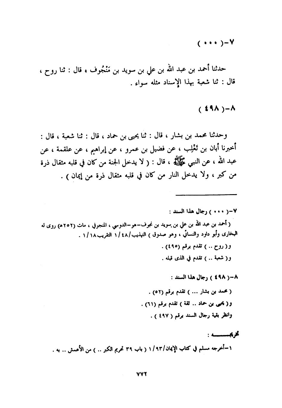 وَحَدَّثَنَا مُحَمَّدُ بْنُ بَشَّارٍ، قَالَ: ثَنَا يَحْيَى بْنُ حَمَّادٍ، قَالَ: ثَنَا شُعْبَةُ، قَالَ: أَخْبَرَنَا أَبَانُ بْنُ تَغْلِبَ، عَنْ فُضَيْلِ بْنِ عَمْرٍو، عَنْ إِبْرَاهِيمَ، عَنْ عَلْقَمَةَ، عَنْ عَبْدِ اللَّهِ، عَنِ النَّبِيِّ صَلَّى اللهُ عَلَيْهِ وَسَلَّمَ قَالَ: «§لَا يَدْخُلُ الْجَنَّةَ مَنْ كَانَ فِي قَلْبِهِ مِثْقَالُ ذَرَّةٍ مِنْ كِبْرٍ، وَلَا يَدْخُلُ النَّارَ مَنْ كَانَ فِي قَلْبِهِ مِثْقَالُ ذَرَّةٍ مِنْ إِيمَانٍ» -[773]- حَدَّثَنَا مُحَمَّدُ بْنُ يَحْيَى، قَالَ: ثَنَا حَرَمِيُّ بْنُ حَفْصِ بْنِ عُمَارَةَ الْعَتَكِيُّ، قَالَ: ثَنَا عَبْدُ الْعَزِيزِ بْنُ مُسْلِمٍ، قَالَ: ثَنَا سُلَيْمَانُ الْأَعْمَشُ، بِمِثْلِ حَدِيثِ أَبِي بَكْرِ بْنِ عَيَّاشٍ فِي إِسْنَادِهِ، وَقَالَ: «مِثْقَالُ حَبَّةِ خَرْدَلٍ مِنْ كِبْرٍ» وَلَمْ يَشُكَّ حَدَّثَنَاهُ أَبُو مُوسَى، قَالَ: ثَنَا عِيسَى بْنُ إِبْرَاهِيمَ، قَالَ: ثَنَا عَبْدُ الْعَزِيزِ بْنُ مُسْلِمٍ، عَنِ الْأَعْمَشِ بِهَذَا الْخَبَرِ مَرْفُوعًا