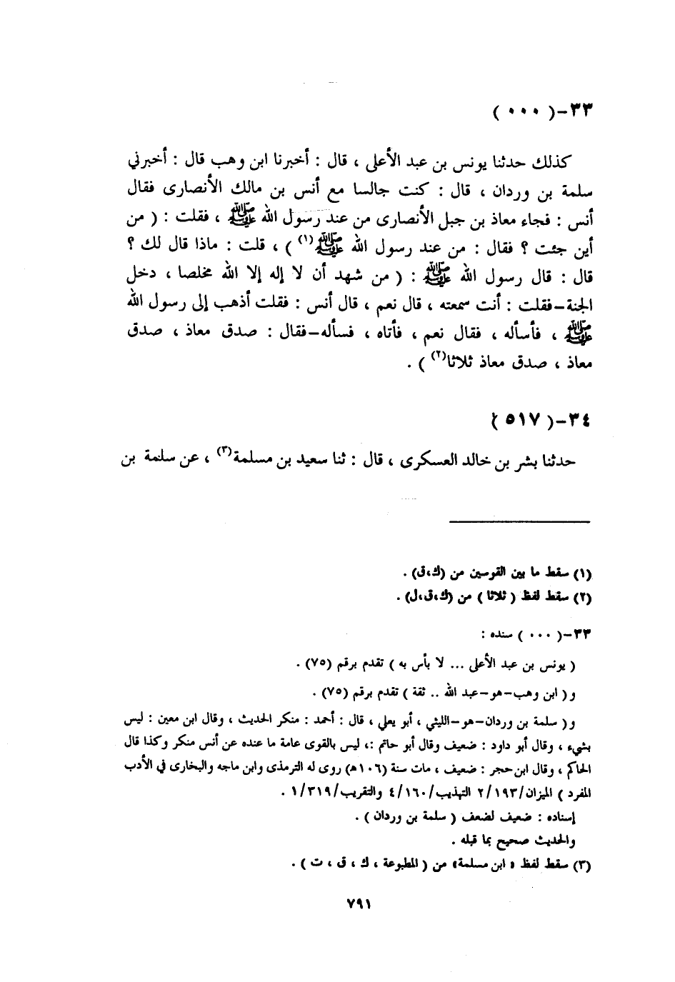 كَذَلِكَ حَدَّثَنَا يُونُسُ بْنُ عَبْدِ الْأَعْلَى، قَالَ: أَخْبَرَنا ابْنُ وَهْبٍ قَالَ: أَخْبَرَنِي سَلَمَةُ بْنُ وَرْدَانَ، قَالَ: كُنْتُ جَالِسًا مَعَ أَنَسِ بْنِ مَالِكٍ الْأَنْصَارِيِّ فَقَالَ أَنَسٌ: فَجَاءَ مُعَاذُ بْنُ جَبَلٍ الْأَنْصَارِيُّ مِنْ عِنْدِ رَسُولِ اللَّهِ صَلَّى اللهُ عَلَيْهِ وَسَلَّمَ، فَقُلْتُ: مِنْ أَيْنَ جِئْتَ؟ فَقَالَ: مِنْ عِنْدِ رَسُولِ اللَّهِ صَلَّى اللهُ عَلَيْهِ وَسَلَّمَ، قُلْتُ: مَاذَا قَالَ لَكَ؟ قَالَ: قَالَ رَسُولُ اللَّهِ صَلَّى اللهُ عَلَيْهِ وَسَلَّمَ: «§مَنْ شَهِدَ أَنْ لَا إِلَهَ إِلَّا اللَّهُ مُخْلِصًا، دَخَلَ الْجَنَّةَ» فَقُلْتُ: أَنْتَ سَمِعْتَهُ، قَالَ: نَعَمْ، قَالَ أَنَسٌ: فَقُلْتُ أَذْهَبُ إِلَى رَسُولِ اللَّهِ صَلَّى اللهُ عَلَيْهِ وَسَلَّمَ، فَأَسْأَلُهُ؟ فَقَالَ: نَعَمْ، فَأَتَاهُ، فَسَأَلَهُ فَقَالَ: «صَدَقَ مُعَاذٌ، صَدَقَ مُعَاذٌ، صَدَقَ مُعَاذٌ، ثَلَاثًا»