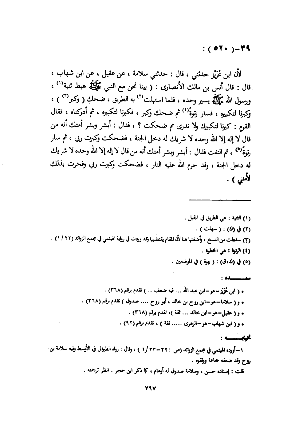 لِأَنَّ ابْنَ عُزَيْزٍ حَدَّثَنِي، قَالَ: حَدَّثَنِي سَلَامَةُ، عَنْ عَقِيلٍ، عَنِ ابْنِ شِهَابٍ، قَالَ: قَالَ أَنَسُ بْنُ مَالِكٍ الْأَنْصَارِيُّ: بَيْنَا نَحْنُ مَعَ النَّبِيِّ صَلَّى اللهُ عَلَيْهِ وَسَلَّمَ هَبَطَ ثَنِيَّةً، وَرَسُولُ اللَّهِ صَلَّى اللهُ عَلَيْهِ وَسَلَّمَ يَسِيرُ وَحْدَهُ، فَلَمَّا اسْتَهَلَّتْ بِهِ الطَّرِيقُ، ضَحِكَ وَكَبَّرَ، وَكَبَّرْنَا لِتَكْبِيرِهِ، فَسَارَ رَتْوَةً ثُمَّ ضَحِكَ وَكَبَّرَ، فَكَبَّرْنَا لِتَكْبِيرِهِ، ثُمَّ أَدْرَكْنَاهُ، فَقَالَ الْقَوْمُ: كَبَّرْنَا لِتَكْبِيرِكَ وَلَا نَدْرِي مِمَّ ضَحِكْتَ؟ فَقَالَ: " أَبْشِرْ وَبِشِّرْ أُمَّتَكَ أَنَّهُ §مَنْ قَالَ لَا إِلَهَ إِلَّا اللَّهُ وَحْدَهُ لَا شَرِيكَ لَهُ دَخَلَ الْجَنَّةَ، فَضَحِكْتُ وَكَبَّرْتُ رَبِّي، ثُمَّ سَارَ رَتْوَةً، ثُمَّ الْتَفَتَ فَقَالَ: أَبْشِرْ وَبَشِّرْ أُمَّتَكَ أَنَّهُ مَنْ قَالَ لَا إِلَهَ إِلَّا اللَّهُ وَحْدَهُ لَا شَرِيكَ لَهُ دَخَلَ الْجَنَّةَ، وَقَدْ حَرَّمَ اللَّهُ عَلَيْهِ النَّارَ، فَضَحِكْتُ وَكَبَّرْتُ رَبِّي وَفَخَرْتُ بِذَلِكَ لِأُمَّتِي " -[798]- قَالَ أَبُو بَكْرٍ: هَذَا خَبَرٌ غَرِيبٌ، وَإِنَّمَا أَنْكَرْتُ مِنْ خَبَرِ سَلَمَةَ بْنِ وَرْدَانَ أَنَّ ذِكْرَهُ أَنَّ أَنَسًا سَمِعَ هَذَا الْخَبَرَ مِنْ مُعَاذِ بْنِ جَبَلٍ، فَإِنَّ سُلَيْمَانَ التَّيْمِيَّ وَهُوَ أَحْفَظُ مِنْ عَدَدٍ مِثْلِ سَلَمَةَ، وَأَعْلَمُ بِالْحَدِيثِ مِنْ جَمَاعَةٍ أَمْثَالَ سَلَمَةَ، رَوَاهُ عَنْ أَنَسٍ قَالَ: ذُكِرَ لِي عَنْ مُعَاذِ بْنِ جَبَلٍ، فَأَمَّا مَنْ قَالَ: عَنْ أَنَسٍ، عَنْ مُعَاذٍ فَقَدْ أَعْذَرَ، وَلَمْ يَذْكُرْ سَمَاعًا كَذَلِكَ رَوَاهُ أَيْضًا عَبْدُ الْعَزِيزِ بْنُ صُهَيْبٍ، عَنْ أَنَسٍ، عَنْ مُعَاذٍ لَمْ يَقُلْ سَمِعْتُ وَلَا ذُكِرَ لِي