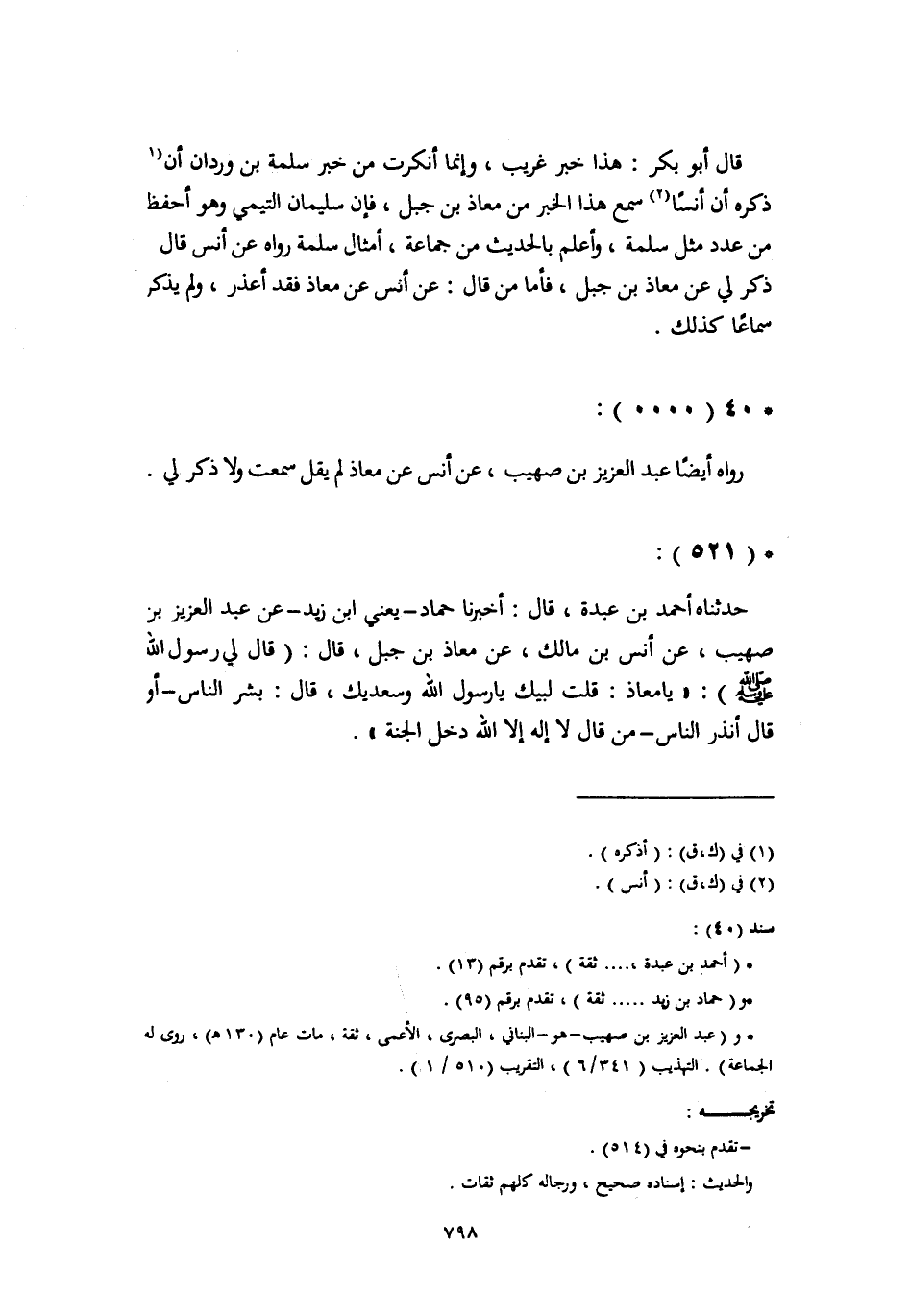 حَدَّثَنَاهُ أَحْمَدُ بْنُ عَبْدَةَ، قَالَ: أَخْبَرَنَا حَمَّادٌ يَعْنِي ابْنَ زَيْدٍ، عَنْ عَبْدِ الْعَزِيزِ بْنِ صُهَيْبٍ، عَنْ أَنَسِ بْنِ مَالِكٍ، عَنْ مُعَاذِ بْنِ جَبَلٍ، قَالَ: قَالَ لِي رَسُولُ اللَّهِ صَلَّى اللهُ عَلَيْهِ وَسَلَّمَ: " يَا مُعَاذُ: قُلْتُ لَبَّيْكَ يَا رَسُولَ اللَّهِ وَسَعْدَيْكَ، قَالَ: بَشِّرِ النَّاسَ أَوْ قَالَ أَنْذِرِ النَّاسَ §مَنْ قَالَ لَا إِلَهَ إِلَّا اللَّهُ دَخَلَ الْجَنَّةَ "