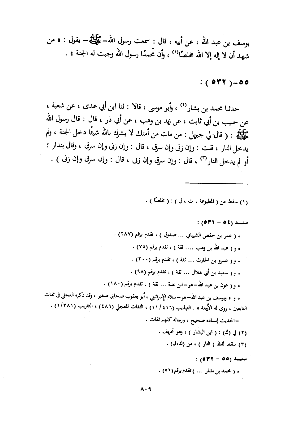 حَدَّثَنَا مُحَمَّدُ بْنُ بَشَّارٍ، وَأَبُو مُوسَى، قَالَا: ثَنَا ابْنُ أَبِي عَدِيٍّ، عَنْ شُعْبَةَ، عَنْ حَبِيبِ بْنِ أَبِي ثَابِتٍ، عَنْ زَيْدِ بْنِ وَهْبٍ، عَنْ أَبِي ذَرٍّ قَالَ: قَالَ رَسُولُ اللَّهِ صَلَّى اللهُ عَلَيْهِ وَسَلَّمَ: " قَالَ لِي جِبْرِيلُ: §مَنْ مَاتَ مِنْ أُمَّتِكَ لَا يُشْرِكُ بِاللَّهِ شَيْئًا دَخَلَ الْجَنَّةَ، وَلَمْ يَدْخُلِ النَّارَ، قُلْتُ: وَإِنْ زَنَى وَإِنْ سَرَقَ، قَالَ: وَإِنْ زَنَى وَإِنْ سَرَقَ " - وَقَالَ بُنْدَارٌ: أَوْ - " لَمْ يَدْخُلِ النَّارَ، قَالَ: وَإِنْ سَرَقَ وَإِنْ زَنَى، قَالَ: وَإِنْ سَرَقَ وَإِنْ زَنَى "