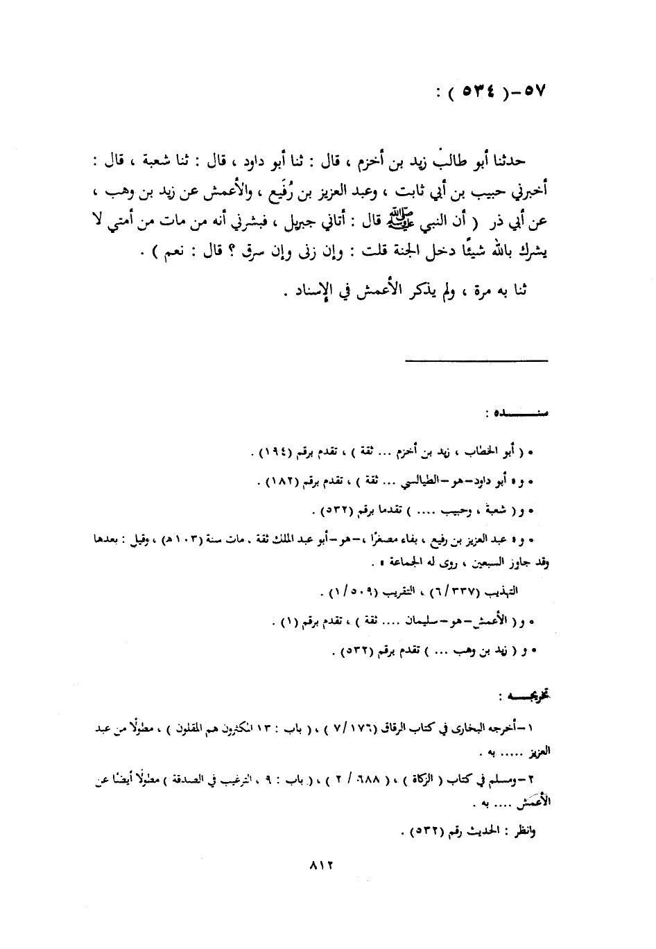 حَدَّثَنَا أَبُو طَالِبٍ زَيْدُ بْنُ أَخْزَمَ، قَالَ: ثَنَا أَبُو دَاوُدَ، قَالَ: ثَنَا شُعْبَةُ، قَالَ: أَخْبَرَنِي حَبِيبُ بْنُ أَبِي ثَابِتٍ، وَعَبْدُ الْعَزِيزِ بْنُ رُفَيْعٍ، وَالْأَعْمَشُ، عَنْ زَيْدِ بْنِ وَهْبٍ، عَنْ أَبِي ذَرٍّ، أَنَّ النَّبِيَّ صَلَّى اللهُ عَلَيْهِ وَسَلَّمَ قَالَ: " أَتَانِي جِبْرِيلُ، فَبَشَّرَنِي أَنَّهُ §مَنْ مَاتَ مِنْ أُمَّتِي لَا يُشْرِكُ بِاللَّهِ شَيْئًا دَخَلَ الْجَنَّةَ قُلْتُ: وَإِنْ زَنَى وَإِنْ سَرَقَ؟ قَالَ: نَعَمْ " ثَنَا بِهِ مَرَّةً، وَلَمْ يَذْكُرِ الْأَعْمَشَ فِي الْإِسْنَادِ