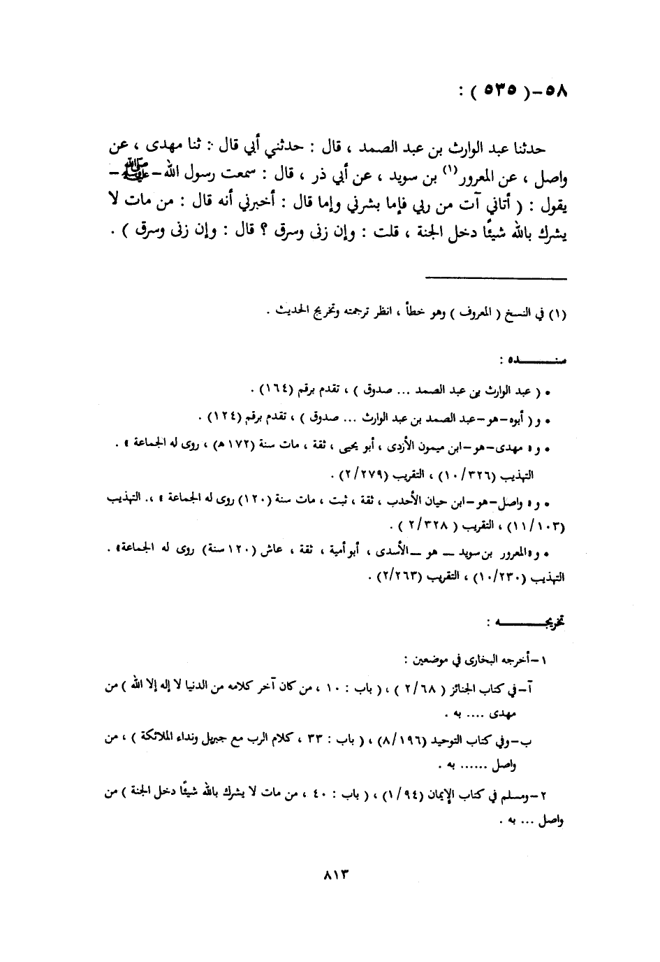 حَدَّثَنَا عَبْدُ الْوَارِثِ بْنُ عَبْدِ الصَّمَدِ، قَالَ: حَدَّثَنِي أَبِي قَالَ: ثَنَا مَهْدِيُّ، عَنْ وَاصِلٍ، عَنِ الْمَعْرُورِ بْنِ سُوَيْدٍ، عَنْ أَبِي ذَرٍّ، قَالَ: سَمِعْتُ رَسُولَ اللَّهِ صَلَّى اللهُ عَلَيْهِ وَسَلَّمَ يَقُولُ: «أَتَانِي آتٍ مِنْ رَبِّي» فَإِمَّا «بَشَّرَنِي» وَإِمَّا قَالَ: «أَخْبَرَنِي» أَنَّهُ قَالَ: " §مَنْ مَاتَ لَا يُشْرِكُ بِاللَّهِ شَيْئًا دَخَلَ الْجَنَّةَ، قُلْتُ: وَإِنْ زَنَى وَسَرَقَ؟ قَالَ: وَإِنْ زَنَى وَسَرَقَ "