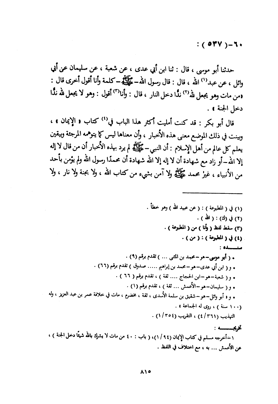 حَدَّثَنَا أَبُو مُوسَى، قَالَ: ثَنَا ابْنُ أَبِي عَدِيٍّ، عَنْ شُعْبَةَ، عَنْ سُلَيْمَانَ، عَنْ أَبِي وَائِلٍ، عَنْ عَبْدِ اللَّهِ، قَالَ: قَالَ رَسُولُ اللَّهِ صَلَّى اللهُ عَلَيْهِ وَسَلَّمَ كَلِمَةً وَأَنَا أَقُولُ أُخْرَى قَالَ: «§مَنْ مَاتَ وَهُوَ يَجْعَلُ لِلَّهِ نِدًّا دَخَلَ النَّارَ» ، قَالَ: وَأَنَا أَقُولُ: وَهُوَ لَا يَجْعَلُ لِلَّهِ نِدًّا دَخَلَ الْجَنَّةَ " قَالَ أَبُو بَكْرٍ: قَدْ كُنْتُ أَمْلَيْتُ أَكْثَرَ هَذَا الْبَابِ فِي كِتَابِ الْإِيمَانِ وَبَيَّنْتُ فِي ذَلِكَ الْمَوْضِعِ مَعْنَى هَذِهِ الْأَخْبَارِ، وَأَنَّ مَعْنَاهَا لَيْسَ كَمَا يَتَوَهَّمُهُ الْمُرْجِئَةُ وَبِيَقِينٍ يَعْلَمُ كُلُّ عَالِمٍ مِنْ أَهْلِ الْإِسْلَامِ أَنَّ النَّبِيَّ صَلَّى اللهُ عَلَيْهِ وَسَلَّمَ لَمْ يُرِدْ بِهَذِهِ الْأَخْبَارِ أَنَّ مَنْ قَالَ لَا إِلَهَ إِلَّا اللَّهُ أَوْ زَادَ مَعَ شَهَادَةِ أَنْ لَا إِلَهَ إِلَّا اللَّهُ شَهَادَةَ أَنَّ مُحَمَّدًا رَسُولُ اللَّهِ وَلَمْ يُؤْمِنْ بِأَحَدٍ مِنَ الْأَنْبِيَاءِ، غَيْرَ مُحَمَّدٍ صَلَّى اللهُ عَلَيْهِ وَسَلَّمَ وَلَا آمَنَ بِشَيْءٍ مِنْ كِتَابِ اللَّهِ، وَلَا بِجَنَّةٍ وَلَا نَارٍ، وَلَا -[816]- بَعْثٍ وَلَا حِسَابٍ أَنَّهُ مِنْ أَهْلِ الْجَنَّةِ، لَا يُعَذَّبُ بِالنَّارِ، وَلَئِنْ جَازَ لِلْمُرْجِئَةِ الِاحْتِجَاجُ بِهَذِهِ الْأَخْبَارِ، وَإِنْ كَانَتْ هَذِهِ الْأَخْبَارُ ظَاهِرُهَا خِلَافُ أَصْلِهِمْ، وَخِلَافُ كِتَابِ اللَّهِ وَخِلَافُ سُنَنِ النَّبِيِّ صَلَّى اللهُ عَلَيْهِ وَسَلَّمَ، جَازَ لِلْجَهْمِيَّةِ الِاحْتِجَاجُ بِأَخْبَارٍ رُوِيَتْ عَنِ النَّبِيِّ صَلَّى اللهُ عَلَيْهِ وَسَلَّمَ إِذَا تُؤُوِّلَتْ عَلَى ظَاهِرِهَا، اسْتَحَقَّ مَنْ يَعْلَمُ أَنَّ اللَّهَ رَبُّهُ وَأَنَّ مُحَمَّدًا نَبِيُّهُ الْجَنَّةَ، وَإِنْ لَمْ يَنْطِقْ بِذَلِكَ لِسَانُهُ، وَلَا يَزَالُ يَسْمَعُ أَهْلَ الْجَهْلِ وَالْعِنَادِ، وَيَحْتَجُّونَ بِأَخْبَارٍ مُخْتَصَرَةٍ، غَيْرِ مُتَقَصَّاةٍ، وَبِأَخْبَارٍ مُجْمَلَةٍ غَيْرِ مُفَسَّرَةٍ، لَا يَفْهَمُونَ أُصُولَ الْعِلْمِ، يَسْتَدِلُّونَ بِالْمُتَقَصَّى مِنَ الْأَخْبَارِ عَلَى مُخْتَصَرِهَا، وَبِالْمُفَسَّرِ مِنْهَا عَلَى مُجْمَلِهَا، قَدْ ثَبَتَتِ الْأَخْبَارُ عَنِ النَّبِيِّ صَلَّى اللهُ عَلَيْهِ وَسَلَّمَ بِلَفْظَةٍ لَوْ حَمَلَتْ عَلَى ظَاهِرِهَا كَمَا حَمَلَتِ الْمُرْجِئَةُ الْأَخْبَارَ الَّتِي ذَكَرْنَاهَا فِي شَهَادَةِ أَنْ لَا إِلَهَ إِلَّا اللَّهُ عَلَى ظَاهِرِهَا لَكَانَ الْعَالِمُ بِقَلْبِهِ: أَنْ لَا إِلَهَ إِلَّا اللَّهُ مُسْتَحِقًّا لِلْجَنَّةَ، وَإِنْ لَمْ يُقِرَّ بِذَلِكَ بِلِسَانِهِ، وَلَا أُقِرُّ بِشَيْءٍ مِمَّا أَمَرَ اللَّهُ تَعَالَى بِالْإِقْرَارِ بِهِ، وَلَا آمَنَ بِقَلْبِهِ بِشَيْءٍ أَمَرَ اللَّهُ بِالْإِيمَانِ بِهِ وَلَا عَمِلَ بِجَوَارِحِهِ شَيْئًا أَمَرَ اللَّهُ بِهِ، وَلَا انْزَجَرَ عَنْ شَيْءٍ حَرَّمَهُ اللَّهُ مِنْ سَفْكِ دِمَاءِ الْمُسْلِمِينَ، وَسَبْيِ ذَرَارِيِّهِمْ وَأَخْذِ أَمْوَالِهِمْ، وَاسْتِحْلَالِ حَرَمِهِمْ فَاسْمَعِ الْخَبَرَ الَّذِي ذَكَرْتُ أَنَّهُ غَيْرُ جَائِزٍ أَنْ يُحْمَلَ عَلَى ظَاهِرِهِ، كَمَا حَمَلَتِ الْمُرْجِئَةُ الْأَخْبَارَ الَّتِي ذَكَرْنَاهَا عَلَى ظَاهِرِهَا