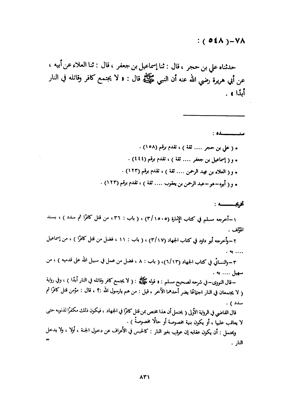 78 - حَدَّثَنَاهُ عَلِيُّ بْنُ حُجْرٍ، قَالَ: ثَنَا إِسْمَاعِيلُ بْنُ جَعْفَرٍ، قَالَ: ثَنَا الْعَلَاءُ، عَنْ أَبِيهِ، عَنْ أَبِي هُرَيْرَةَ، رَضِيَ اللَّهُ عَنْهُ أَنَّ النَّبِيَّ صَلَّى اللهُ عَلَيْهِ وَسَلَّمَ قَالَ: «§لَا يَجْتَمِعُ كَافِرٌ وَقَاتِلُهُ فِي النَّارِ أَبَدًا» -[832]- قَالَ أَبُو بَكْرٍ: وَهَذَا الْجِنْسُ مِنْ فَضَائِلِ الْأَعْمَالِ، يَطُولُ بِتَقَصِّيهِ الْكِتَابَ، وَفِي قَدْرِ مَا ذَكَرْنَا غُنْيَةً وِكِفَايَةً لِمَا لَهُ قَصَدْنَا أَنَّ النَّبِيَّ صَلَّى اللهُ عَلَيْهِ وَسَلَّمَ إِنَّمَا خَبَّرَ بِفَضَائِلِ هَذِهِ الْأَعْمَالِ الَّتِي ذَكَرْنَا، وَمَا هُوَ مِثْلَهَا، لَا أَنَّ النَّبِيَّ صَلَّى اللهُ عَلَيْهِ وَسَلَّمَ أَرَادَ أَنَّ كُلَّ عَمَلٍ ذَكَرَهُ أَعْلَمَ أَنَّ عَامِلَهُ يَسْتَوْجِبُ بِفِعْلِهِ الْجَنَّةَ، أَوْ يُعَاذُ مِنَ النَّارِ أَنَّهُ جَمِيعُ الْإِيمَانِ وَكَذَلِكَ إِنَّمَا أَرَادَ النَّبِيُّ صَلَّى اللهُ عَلَيْهِ وَسَلَّمَ بِقَوْلِهِ: «مَنْ قَالَ لَا إِلَهَ إِلَّا اللَّهُ دَخَلَ الْجَنَّةَ أَوْ حُرِّمَ عَلَى النَّارِ» فَضِيلَةً لِهَذَا الْقَوْلِ، لَا أَنَّهُ جَمِيعُ الْإِيمَانِ كَمَا ادَّعَى مَنْ لَا يَفْهَمُ الْعِلْمَ وَيُعَانِدُ، فَلَا يَتَعَلَّمُ هَذِهِ الصِّنَاعَةَ مِنْ أَهْلِهَا، وَمَعْنَى قَوْلِهِ صَلَّى اللهُ عَلَيْهِ وَسَلَّمَ: «لَا يَجْتَمِعُ كَافِرٌ وَقَاتِلُهُ فِي النَّارِ أَبَدًا» هَذَا لَفْظٌ مُخْتَصَرُهُ: الْخَبَرُ الْمُتَقَصَّى لِهَذِهِ اللَّفْظَةِ الْمُخْتَصَرَةِ
