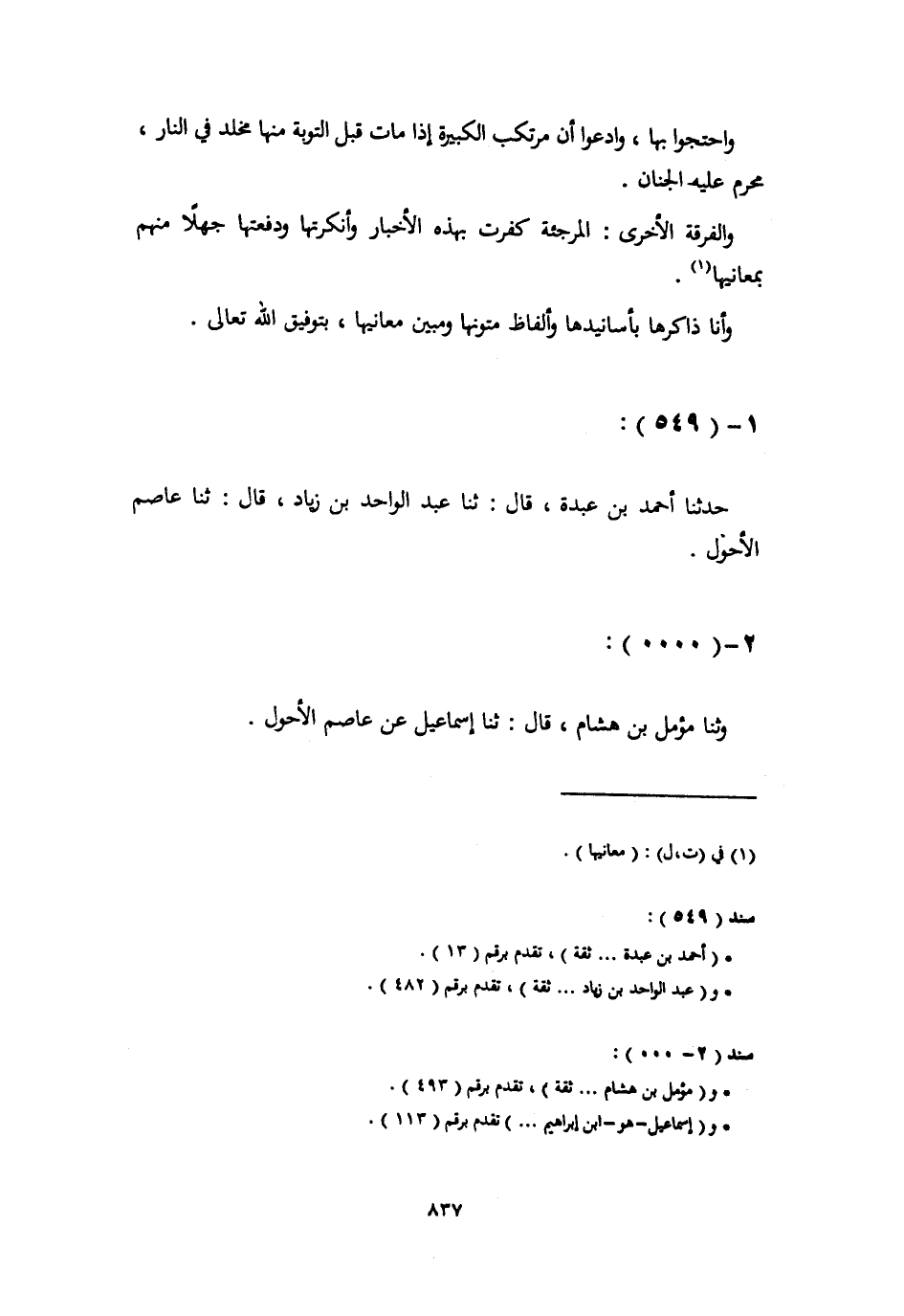 حَدَّثَنَا أَحْمَدُ بْنُ عَبْدَةَ، قَالَ: ثَنَا عَبْدُ الْوَاحِدِ بْنُ زِيَادٍ، قَالَ: ثَنَا عَاصِمٌ الْأَحْوَلُ، وَثَنَا مُؤَمَّلُ بْنُ هِشَامٍ، قَالَ: ثَنَا إِسْمَاعِيلُ، عَنْ عَاصِمٍ الْأَحْوَلِ -[838]-، وَثَنَا سَلْمُ بْنُ جُنَادَةَ، قَالَ: ثَنَا أَبُو مُعَاوِيَةَ، قَالَ: ثَنَا عَاصِمٌ، عَنْ أَبِي عُثْمَانَ، قَالَ: سَمِعْتُ سَعْدَ بْنَ أَبِي وَقَّاصٍ، وَأَبَا بَكْرَةَ، قَالَا: سَمِعِتْهُ أُذُنَايَ وَوَعَاهُ، قَلْبِي مِنْ مُحَمَّدٍ صَلَّى اللهُ عَلَيْهِ وَسَلَّمَ يَقُولُ: «§مَنِ ادَّعَى إِلَى غَيْرِ أَبِيهِ وَهُوَ يَعْلَمُ أَنَّهُ غَيْرُ أَبِيهِ، فَالْجَنَّةُ عَلَيْهِ حَرَامٌ» هَذَا حَدِيثُ عَبْدِ الْوَاحِدِ وَأَبِي مُعَاوِيَةَ، وَفِي خَبَرِ ابْنِ عُلَيَّةَ مِثْلُ مَعْنَاهُ