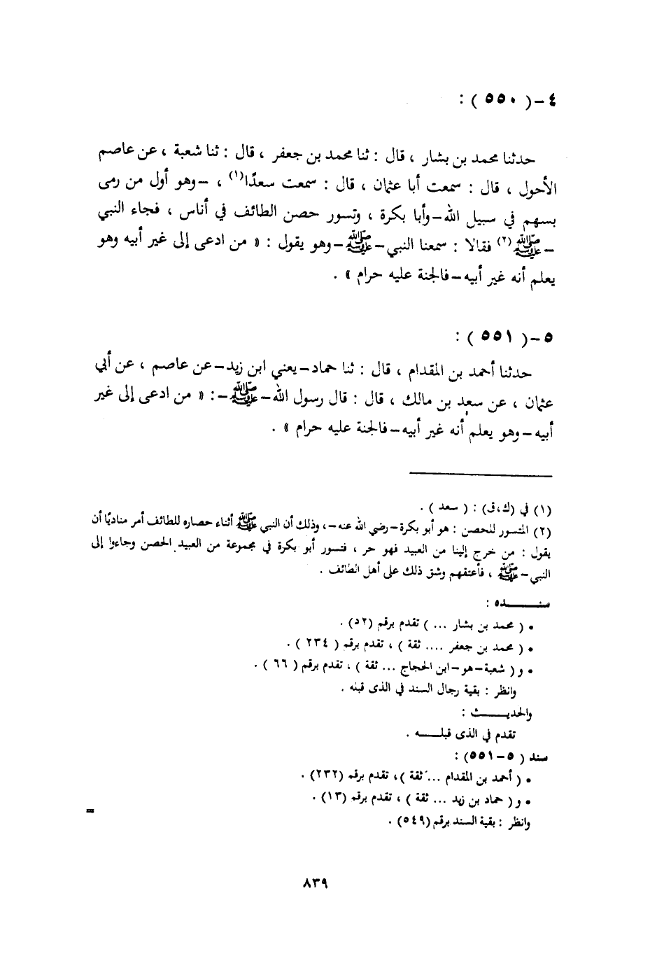 حَدَّثَنَا مُحَمَّدُ بْنُ بَشَّارٍ، قَالَ: ثَنَا مُحَمَّدُ بْنُ جَعْفَرٍ، قَالَ: ثَنَا شُعْبَةُ، عَنْ عَاصِمٍ الْأَحْوَلِ، قَالَ: سَمِعْتُ أَبَا عُثْمَانَ، قَالَ: سَمِعْتُ سَعْدًا، وَهُو أَوَّلُ مَنْ رَمَى بِسَهْمٍ فِي سَبِيلِ اللَّهِ وَأَبَا بَكْرَةَ، وَتَسَوَّرَ حِصْنَ الطَّائِفِ فِي أُنَاسٍ، فَجَاءَ النَّبِيُّ صَلَّى اللهُ عَلَيْهِ وَسَلَّمَ فَقَالَا: سَمِعْنَا النَّبِيَّ صَلَّى اللهُ عَلَيْهِ وَسَلَّمَ وَهُوَ يَقُولُ: «§مَنِ ادَّعَى إِلَى غَيْرِ أَبِيهِ وَهُوَ يَعْلَمُ أَنَّهُ غَيْرُ أَبِيهِ فَالْجَنَّةُ عَلَيْهِ حَرَامٌ»