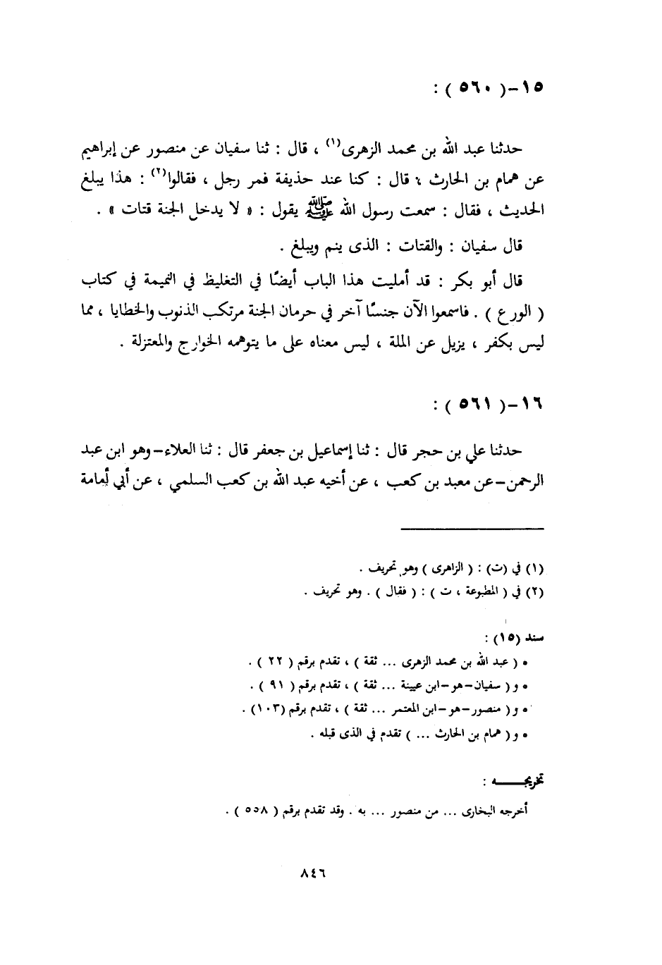 حَدَّثَنَا عَبْدُ اللَّهِ بْنُ مُحَمَّدٍ الزُّهْرِيُّ، قَالَ: ثَنَا سُفْيَانُ، عَنْ مَنْصُورٍ، عَنْ إِبْرَاهِيمَ، عَنْ هَمَّامِ بْنِ الْحَارِثِ، قَالَ: كُنَّا عِنْدَ حُذَيْفَةَ فَمَرَّ رَجُلٌ، فَقَالُوا: هَذَا يُبَلِّغُ الْحَدِيثَ، فَقَالَ: سَمِعْتُ رَسُولَ اللَّهِ صَلَّى اللهُ عَلَيْهِ وَسَلَّمَ يَقُولُ: «§لَا يَدْخُلُ الْجَنَّةَ قَتَّاتٌ» قَالَ سُفْيَانُ: وَالْقَتَّاتُ: الَّذِي يَنُمُّ وَيُبَلِّغُ قَالَ أَبُو بَكْرٍ: قَدْ أَمْلَيْتُ هَذَا الْبَابَ أَيْضًا فِي التَّغْلِيظِ فِي النَّمِيمَةِ فِي كِتَابِ الْوَرَعِ فَاسْمَعُوا الْآنَ جِنْسًا آخَرَ فِي حِرْمَانِ الْجَنَّةِ مُرْتَكِبَ الذُّنُوبِ وَالْخَطَايَا، مِمَّا لَيْسَ بِكُفْرٍ، يُزِيلُ عَنِ الْمِلَّةِ، لَيْسَ مَعْنَاهُ عَلَى مَا يَتَوَهَّمُهُ الْخَوَارِجُ، وَالْمُعْتَزِلَةُ
