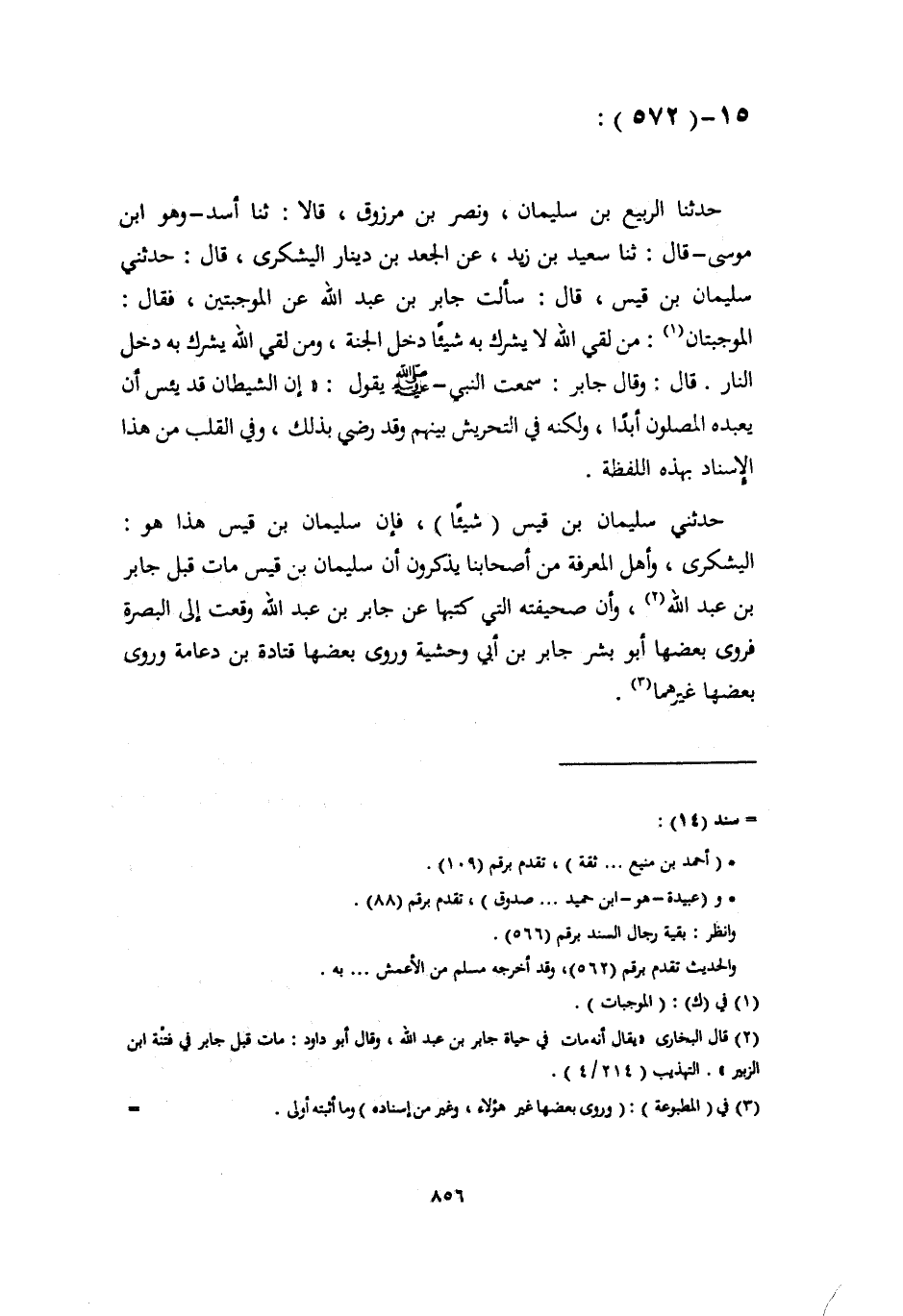 حَدَّثَنَا الرَّبِيعُ بْنُ سُلَيْمَانَ، وَنَصْرُ بْنُ مَرْزُوقٍ، قَالَا: ثَنَا أَسَدٌ، وَهُوَ ابْنُ مُوسَى قَالَ: ثَنَا سَعِيدُ بْنُ زَيْدٍ، عَنِ الْجَعْدِ بْنِ دِينَارٍ الْيَشْكُرِيِّ، قَالَ: حَدَّثَنِي سُلَيْمَانُ بْنُ قَيْسٍ، قَالَ: سَأَلْتُ جَابِرَ بْنَ عَبْدِ اللَّهِ عَنِ الْمُوجِبَتَيْنِ، فَقَالَ: الْمُوجِبَتَانِ: مَنْ لَقِيَ اللَّهَ لَا يُشْرِكُ بِهِ شَيْئًا دَخَلَ الْجَنَّةَ، وَمَنْ لَقِيَ اللَّهَ يُشْرِكُ بِهِ دَخَلَ النَّارَ قَالَ: وَقَالَ جَابِرٌ: سَمِعْتُ النَّبِيَّ صَلَّى اللهُ عَلَيْهِ وَسَلَّمَ يَقُولُ: «§إِنَّ الشَّيْطَانَ قَدْ يَئِسَ أَنْ يَعْبُدَهُ الْمُصَلُّونَ أَبَدًا، وَلَكِنَّهُ فِي التَّحْرِيشِ بَيْنَهُمْ وَقَدْ رَضِيَ بِذَلِكَ» وَفِي الْقَلْبِ مِنْ هَذَا الْإِسْنَادِ بِهَذِهِ اللَّفْظَةِ حَدَّثَنِي سُلَيْمَانُ بْنُ قَيْسٍ شَيْئًا، فَإِنَّ سُلَيْمَانَ بْنَ قَيْسٍ هَذَا هُوَ الْيَشْكُرِيُّ، وَأَهْلُ الْمَعْرِفَةِ مِنْ أَصْحَابِنَا يَذْكُرُونَ أَنَّ سُلَيْمَانَ بْنَ قَيْسٍ مَاتَ قَبْلَ جَابِرِ بْنِ عَبْدِ اللَّهِ، وَأَنَّ صَحِيفَتَهُ الَّتِي كَتَبَهَا عَنْ جَابِرِ بْنِ عَبْدِ اللَّهِ وَقَعَتْ إِلَى الْبَصْرَةِ فَرَوَى بَعْضَهَا أَبُو بِشْرٍ جَابِرُ بْنُ أَبِي وَحْشِيَّةَ وَرَوَى بَعْضَهَا قَتَادَةُ بْنُ دِعَامَةَ وَرَوَى بَعْضَهَا غَيْرُهُمَا