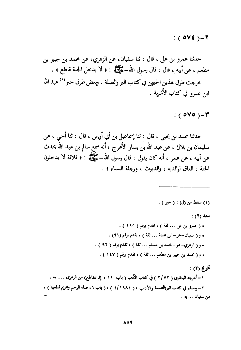 حَدَّثنا عَمْرُو بْنُ عَلِيٍّ، قَالَ: ثَنَا سُفْيَانُ، عَنِ الزُّهْرِيِّ، عَنْ مُحَمَّدِ بْنِ جُبَيْرِ بْنِ مُطْعِمٍ، عَنْ أَبِيهِ، قَالَ: قَالَ رَسُولُ اللَّهِ صَلَّى اللهُ عَلَيْهِ وَسَلَّمَ: «§لَا يَدْخُلُ الْجَنَّةَ قَاطِعٌ» خَرَّجْتُ طُرُقَ هَذَيْنِ الْخَبَرَيْنِ فِي كِتَابِ الْبِرِّ وَالصِّلَةِ، وَبَعْضَ طُرُقِ خَبَرِ عَبْدِ اللَّهِ بْنِ عَمْرٍو فِي كِتَابِ الْأَشْرِبَةِ