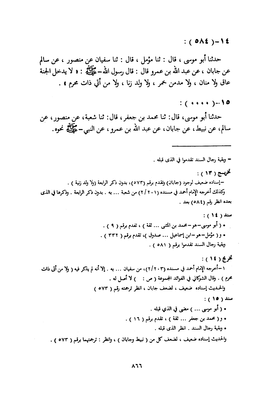 حَدَّثَنَا أَبُو مُوسَى، قَالَ: ثَنَا مُؤَمَّلٌ، قَالَ: ثَنَا سُفْيَانُ، عَنْ مَنْصُورٍ، عَنْ سَالِمٍ، عَنْ جَابَانَ، عَنْ عَبْدِ اللَّهِ بْنِ عَمْرٍو، قَالَ: قَالَ رَسُولُ اللَّهِ صَلَّى اللهُ عَلَيْهِ وَسَلَّمَ: «§لَا يَدْخُلُ الْجَنَّةَ عَاقٌّ وَلَا مَنَّانٌ، وَلَا مُدْمِنُ خَمْرٍ، وَلَا وَلَدُ زِنًا، وَلَا مَنْ أَتَى ذَاتَ مَحْرَمٍ» حَدَّثَنَا أَبُو مُوسَى، قَالَ: ثَنَا مُحَمَّدُ بْنُ جَعْفَرٍ، قَالَ: ثَنَا شُعْبَةُ، عَنْ مَنْصُورٍ، عَنْ سَالِمٍ، عَنْ نُبَيْطٍ، عَنْ جَابَانَ، عَنْ عَبْدِ اللَّهِ بْنِ عَمْرٍو، عَنِ النَّبِيِّ صَلَّى اللهُ عَلَيْهِ وَسَلَّمَ نَحْوَهُ