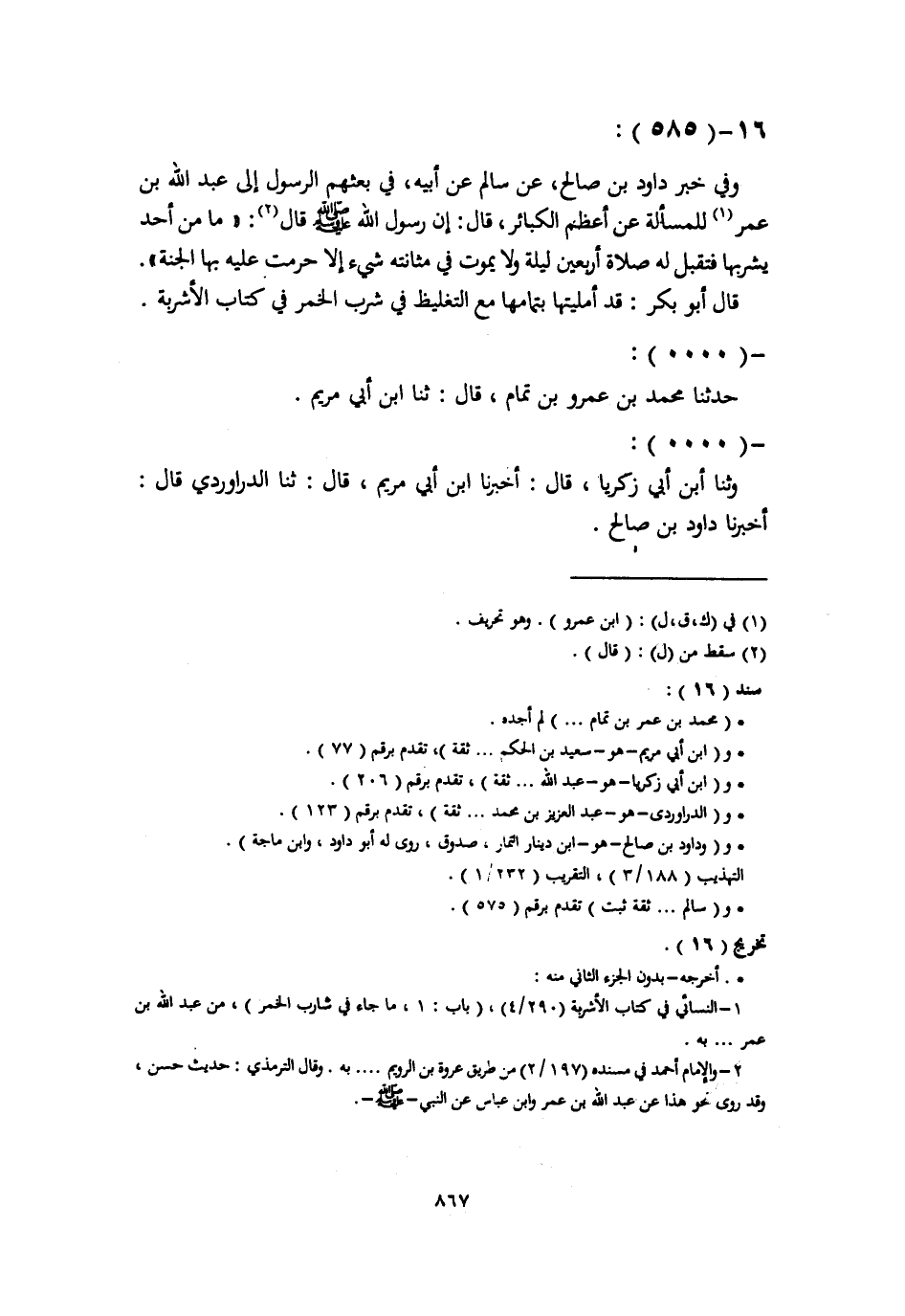 وَفِي خَبَرِ دَاوُدَ بْنِ صَالِحٍ، عَنْ سَالِمٍ، عَنْ أَبِيهِ، فِي بَعْثِهِمُ الرَّسُولُ إِلَى عَبْدِ اللَّهِ بْنِ عُمَرَ لِلْمَسْأَلَةِ عَنْ أَعْظَمِ الْكَبَائِرِ، قَالَ: إِنَّ رَسُولَ اللَّهِ صَلَّى اللهُ عَلَيْهِ وَسَلَّمَ قَالَ: «§مَا مِنْ أَحَدٍ يَشْرَبُهَا فَتُقْبَلُ لَهُ صَلَاةٌ أَرْبَعِينَ لَيْلَةً وَلَا يَمُوتُ فِي مَثَانَتِهِ شَيْءٌ إِلَّا حُرِّمَتْ عَلَيْهِ بِهَا الْجَنَّةُ» قَالَ أَبُو بَكْرٍ: قَدْ أَمْلَيْتُهَا بِتَمَامِهَا مَعَ التَّغْلِيظِ فِي شُرْبِ الْخَمْرِ فِي كِتَابِ الْأَشْرِبَةِ حَدَّثَنَا مُحَمَّدُ بْنُ عَمْرِو بْنِ تَمَامٍ، قَالَ: ثَنَا ابْنُ أَبِي مَرْيَمَ وَثَنَا ابْنُ أَبِي زَكَرِيَّا، قَالَ: أَخْبَرَنا ابْنُ أَبِي مَرْيَمَ، قَالَ: ثَنَا الدَّرَاوَرْدِيُّ قَالَ: أَخْبَرَنَا دَاوُدُ بْنُ صَالِحٍ -[868]- قَالَ أَبُو بَكْرٍ: مَعْنَى هَذَا الْخَبَرِ إِنْ ثَبَتَ عَنِ النَّبِيِّ صَلَّى اللهُ عَلَيْهِ وَسَلَّمَ مَا قَدْ أَعْلَمْتُ أَصْحَابِي مُنْذُ دَهْرٍ طَوِيلٍ، أَنَّ مَعْنَى الْأَخْبَارِ إِنَّمَا هُوَ عَلَى أَحَدِ مَعْنَيَيْنِ: أَحَدُهُمَا: لَا يَدْخُلُ الْجَنَّةَ: أَيْ بَعْضَ الْجِنَّانِ، إِذِ النَّبيُّ صَلَّى اللهُ عَلَيْهِ وَسَلَّمَ قَدْ أَعْلَمَ أَنَّهَا جِنَانٌ فِي جَنَّةٍ، وَاسْمُ الْجَنَّةِ وَاقِعٌ عَلَى كُلِّ جَنَّةٍ مِنْهَا، فَمَعْنَى هَذِهِ الْأَخْبَارِ الَّتِي ذَكَرْنَا: مَنْ فَعَلَ كَذَا، لِبَعْضِ الْمَعَاصِي، حَرَّمَ اللَّهُ عَلَيْهِ الْجَنَّةَ، أَوْ لَمْ يَدْخُلِ الْجَنَّةَ، مَعْنَاهَا: لَا يَدْخُلُ بَعْضَ الْجِنَانِ الَّتِي هِيَ أَعْلَى وَأَشْرَفُ وَأَنْبَلُ وَأَكْثَرُ نَعِيمًا وَسُرُورًا وَبَهْجَةً وَأَوْسَعُ، لَا أَنَّهُ أَرَادَ لَا يَدْخُلُ شَيْئًا مِنْ تِلْكَ الْجِنَانِ الَّتِي هِيَ فِي الْجَنَّةِ، وَعَبْدُ اللَّهِ بْنُ عَمْرٍو قَدْ بَيَّنَ خَبَرَهُ الَّذِي رُوِيَ عَنِ النَّبِيِّ صَلَّى اللهُ عَلَيْهِ وَسَلَّمَ: «لَا يَدْخُلُ الْجَنَّةَ عَاقٌّ، وَلَا مَنَّانٌ وَلَا مُدْمِنُ خَمْرٍ» أَنَّهُ إِنَّمَا أَرَادَ حَظِيرَةَ الْقُدُسِ مِنَ الْجَنَّةِ عَلَى مَا تَأَوَّلْتُ أَحَدَ الْمَعْنَيَيْنِ