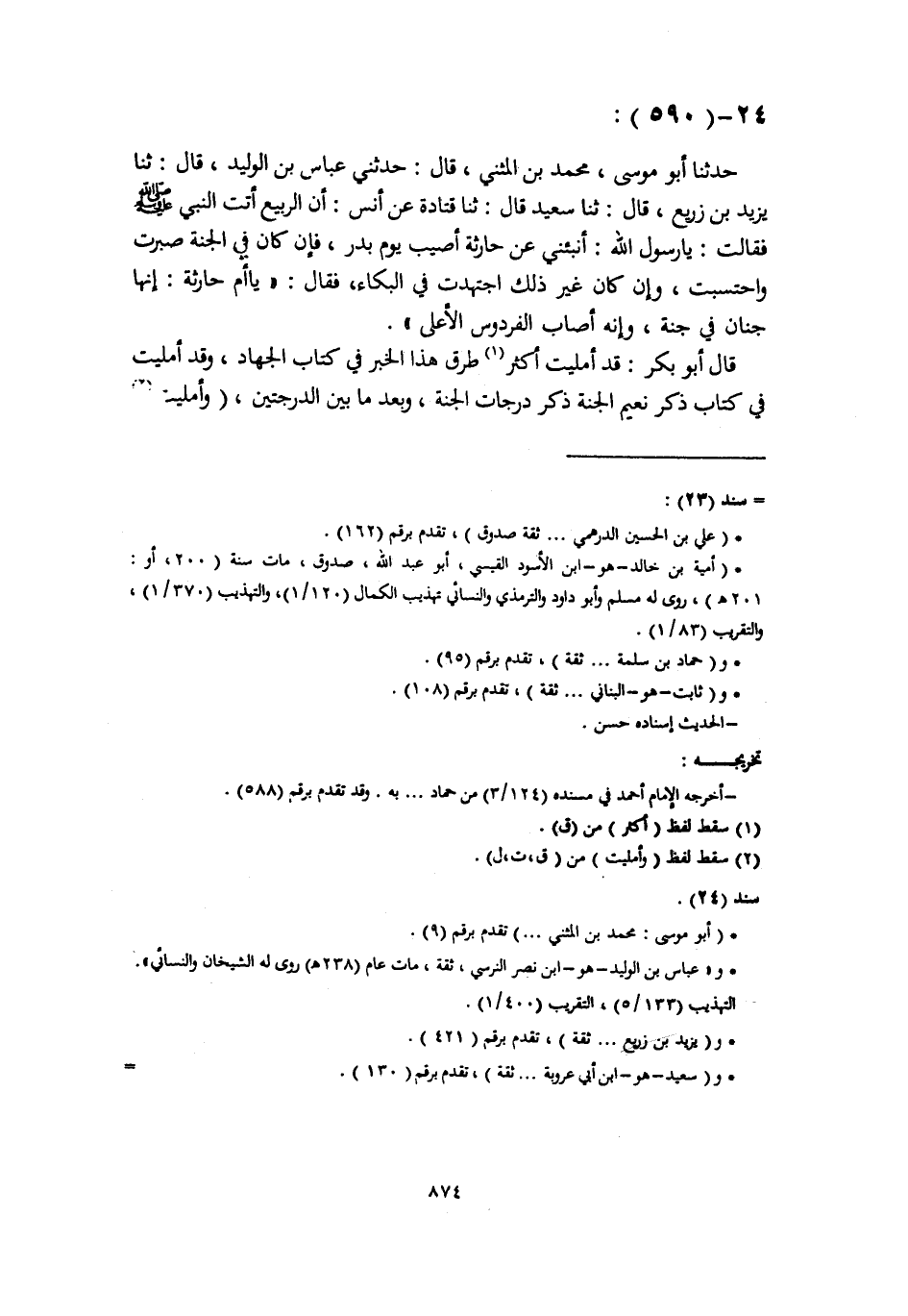 حَدَّثَنَا أَبُو مُوسَى مُحَمَّدُ بْنُ الْمُثَنَّى، قَالَ: حَدَّثَنِي عَبَّاسُ بْنُ الْوَلِيدِ، قَالَ: ثَنَا يَزِيدُ بْنُ زُرَيْعٍ، قَالَ: ثَنَا سَعِيدٌ، قَالَ: ثَنَا قَتَادَةُ، عَنْ أَنَسٍ، أَنَّ الرُّبَيِّعَ أَتَتِ النَّبِيَّ صَلَّى اللهُ عَلَيْهِ وَسَلَّمَ فَقَالَتْ: يَا رَسُولَ اللَّهِ: أَنْبِئْنِي عَنْ حَارِثَةَ أُصِيبَ يَوْمَ بَدْرٍ، فَإِنْ كَانَ فِي الْجَنَّةِ صَبَرْتُ وَاحْتَسَبْتُ، وَإِنْ كَانَ غَيْرَ ذَلِكَ اجْتَهَدْتُ فِي الْبُكَاءِ، فَقَالَ: «يَا أُمَّ حَارِثَةَ، §إِنَّهَا جِنَانٌ فِي جَنَّةٍ، وَإِنَّهُ أَصَابَ الْفِرْدَوْسَ الْأَعْلَى» قَالَ أَبُو بَكْرٍ: قَدْ أَمْلَيْتُ أَكْثَرَ طُرُقِ هَذَا الْخَبَرِ فِي كِتَابِ الْجِهَادِ، وَقَدْ أَمْلَيْتُ فِي كِتَابِ ذِكْرِ نَعِيمِ الْجَنَّةِ ذِكْرَ دَرَجَاتِ الْجَنَّةِ، وَبُعْدَ مَا بَيَّنَ الدَّرَجَتَيْنِ، وَأَمْلَيْتُ -[875]- أَخْبَارَ النَّبِيِّ صَلَّى اللهُ عَلَيْهِ وَسَلَّمَ: " أَنَّ أَهْلَ الْجَنَّةِ لَيَتَرَاءَوْنَ أَهْلَ الْغُرَفِ، كَمَا تَرَاءَوْنَ الْكَوْكَبَ الدُّرِّيَّ فِي أُفُقٍ مِنْ آفَاقِ السَّمَاءِ لِتَفَاضُلِ مَا بَيْنَهُمَا، وَقَوْلُ بَعْضِ أَصْحَابِهِ: تِلْكَ مَنَازِلُ الْأَنْبِيَاءِ لَا يَبْلُغُهَا غَيْرُهُمْ، قَالَ: بَلَى، رِجَالٌ آمَنُوا بِاللَّهِ، وَصَدَّقُوا الْمُرْسَلِينَ «وَأَمْلَيْتُ أَخْبَارَ النَّبِيِّ صَلَّى اللهُ عَلَيْهِ وَسَلَّمَ» بَيْنَ كُلِّ دَرَجَتَيْنِ مِنْ دَرَجِ الْجَنَّةِ مَسِيرَةُ مِائَةِ عَامٍ " فَمَعْنَى هَذِهِ الْأَخْبَارِ الَّتِي فِيهَا ذِكْرُ بَعْضِ الذُّنُوبِ الَّتِي يَرْتَكِبُهَا بَعْضُ الْمُؤْمِنِينَ فَإِنَّ النَّبِيَّ صَلَّى اللهُ عَلَيْهِ وَسَلَّمَ يَعْنِي قَالَ: إِنَّ مُرْتَكِبَهَا لَا يَدْخُلُ الْجَنَّةَ، مَعْنَاهَا أَنَّهُ لَا يَدْخُلُ الْعَالِيَ مِنَ الْجِنَّانِ الَّتِي هِيَ دَارُ الْمُتَّقِينَ الَّذِينَ لَمْ يَرْتَكِبُوا تِلْكَ الذُّنُوبَ وَالْخَطَايَا وَالْحُوبَاتِ، وَقَدْ كُنْتُ أَقُولُ وَأَنَا حَدَثٌ: جَائِزٌ أَنْ يَكُونَ مَعْنَى أخْبَارِ النَّبِيِّ صَلَّى اللهُ عَلَيْهِ وَسَلَّمَ: «لَا يَدْخُلُ النَّارَ مَنْ كَانَ فِي قَلْبِهِ مِثْقَالُ ذَرَّةٍ مِنْ إِيمَانٍ» : أَيْ لَا يَدْخُلُ النَّارَ دُخُولَ الْأَبَدِ، كَدُخُولِ أَهْلِ الشِّرْكِ وَالْأَوْثَانِ، كَمَا قَالَ النَّبِيُّ صَلَّى اللهُ عَلَيْهِ وَسَلَّمَ: «أَمَّا أَهْلُ النَّارِ الَّذِينَ هُمْ أَهْلُهَا لَا يَمُوتُونَ فِيهَا وَلَا يَحْيَوْنَ» الْأَخْبَارُ الَّتِي قَدْ أَمْلَيْتُهَا بِتَمَامِهَا، أَوْ يَكُونُ مَعْنَاهَا أَيْ: لَا يَدْخُلُونَ النَّارَ مَوْضِعَ الْكُفَّارِ وَالْمُشْرِكِينَ مِنَ النَّارِ، إِذِ اللَّهُ عَزَّ وَجَلَّ قَدْ أَعْلَمَ أَنَّ لِلنَّارِ سَبْعَةَ أَبْوَابٍ، وَأَخْبَرَ أَنَّ لِكُلِّ بَابٍ مِنْهُمْ جُزْءًا مَقْسُومًا، فَقَالَ: {لَهَا سَبْعَةُ أَبْوَابٍ} [الحجر: 44]