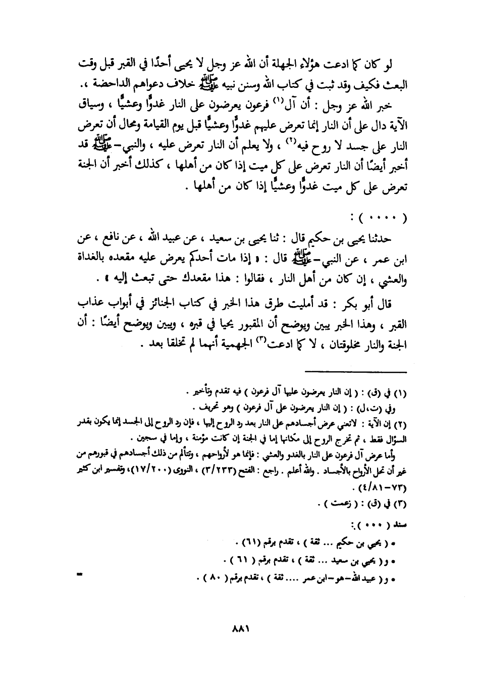 لَوْ كَانَ كَمَا ادَّعَتْ هَؤُلَاءِ الْجَهَلَةُ أَنَّ اللَّهَ عَزَّ وَجَلَّ لَا يُحْيِي أَحَدًا فِي الْقَبْرِ قَبْلَ وَقْتِ الْبَعْثِ فَكَيْفَ وَقَدْ ثَبَتَ فِي كِتَابِ اللَّهِ وَسُنَنِ نَبِيِّهِ صَلَّى اللهُ عَلَيْهِ وَسَلَّمَ خِلَافَ دَعْوَاهُمُ الدَّاحِضَةِ، خَبَرَ اللَّهِ عَزَّ وَجَلَّ أَنَّ آلَ فِرْعَوْنَ يُعْرَضُونَ عَلَى النَّارِ غُدُوًّا وَعَشِيًّا، وَسِيَاقُ الْآيَةِ دَالٌّ عَلَى أَنَّ النَّارَ إِنَّمَا تُعْرَضُ عَلَيْهِمْ غُدُوًّا وَعَشِيًّا قَبْلَ يَوْمِ الْقِيَامَةِ وَمُحَالٌ أَنْ تُعْرَضَ النَّارُ عَلَى جَسَدٍ لَا رُوحَ فِيهِ، وَلَا يَعْلَمُ أَنَّ النَّارَ تُعْرَضُ عَلَيْهِ، وَالنَّبِيُّ صَلَّى اللهُ عَلَيْهِ وَسَلَّمَ قَدْ أَخْبَرَ أَيْضًا أَنَّ النَّارَ تُعْرَضُ عَلَى كُلِّ مَيِّتٍ إِذَا كَانَ مِنْ أَهْلِهَا، كَذَلِكَ أَخْبَرَ أَنَّ الْجَنَّةَ تُعْرَضُ عَلَى كُلِّ مَيِّتٍ غُدُوًّا وَعَشِيًّا إِذَا كَانَ مِنْ أَهْلِهَا