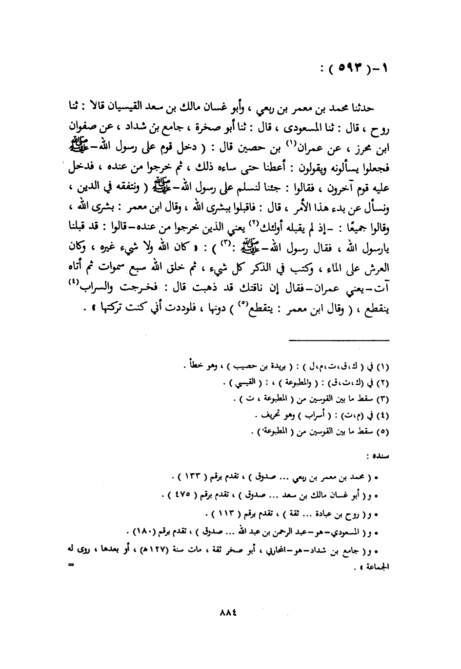 حَدَّثَنَا مُحَمَّدُ بْنُ مَعْمَرِ بْنِ رِبْعِيٍّ، وَأَبُو غَسَّانَ مَالِكُ بْنُ سَعْدٍ الْقَيْسِيَّانِ قَالَا: ثَنَا رَوْحٌ، قَالَ: ثَنَا الْمَسْعُودِيُّ، قَالَ: ثَنَا أَبُو صَخْرَةَ جَامِعُ بْنُ شَدَّادٍ، عَنْ صَفْوَانَ بْنِ مُحْرِزٍ، عَنْ عِمْرَانَ بْنِ حُصَيْنٍ، قَالَ: دَخَلَ قَوْمٌ عَلَى رَسُولِ اللَّهِ صَلَّى اللهُ عَلَيْهِ وَسَلَّمَ فَجَعَلُوا يَسْأَلُونَهُ وَيَقُولُونَ: أَعْطِنَا حَتَّى سَاءَهُ ذَلِكَ، ثُمَّ خَرَجُوا مِنْ عِنْدِهِ، فَدَخَلَ عَلَيْهِ قَوْمٌ آخَرُونَ، فَقَالُوا: جِئْنَا لِنُسَلِّمَ عَلَى رَسُولِ اللَّهِ صَلَّى اللهُ عَلَيْهِ وَسَلَّمَ وَنَتَفَقَّهَ فِي الدِّينِ، وَنَسْأَلَ عَنْ بَدْءِ هَذَا الْأَمْرِ، قَالَ: «فَاقْبَلُوا بِبُشْرَى اللَّهِ» ، وَقَالَ ابْنُ مَعْمَرٍ: «بُشْرَى اللَّهِ» ، وَقَالُوا جَمِيعًا: «إِذْ لَمْ يَقْبَلْهُ أُولَئِكَ» يَعْنِي الَّذِينَ خَرَجُوا مِنْ عِنْدِهِ قَالُوا: قَدْ قَبِلْنَا يَا رَسُولَ اللَّهِ، فَقَالَ رَسُولُ اللَّهِ صَلَّى اللهُ عَلَيْهِ وَسَلَّمَ: «كَانَ اللَّهُ وَلَا شَيْءَ غَيْرَهُ، §وَكَانَ الْعَرْشُ عَلَى الْمَاءِ، وَكَتَبَ فِي الذِّكْرِ كُلَّ شَيْءٍ، ثُمَّ خَلَقَ اللَّهُ سَبْعَ سَمَاوَاتٍ» ثُمَّ أَتَاهُ آتٍ يَعْنِي عِمْرَانَ فَقَالَ: إِنَّ نَاقَتَكَ قَدْ ذَهَبَتْ قَالَ: فَخَرَجْتُ وَالسَّرَابُ يَنْقَطِعُ، وَقَالَ ابْنُ مَعْمَرٍ: يَتَقَطَّعُ دُونَهَا، فَلَوَدِدْتُ أَنِّي كُنْتُ تَرَكْتُهَا "