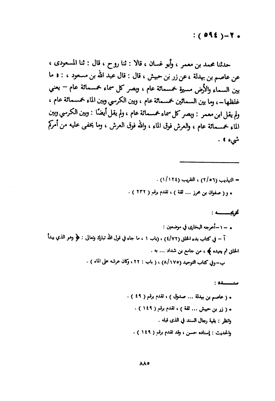 حَدَّثَنَا مُحَمَّدُ بْنُ مَعْمَرٍ، وَأَبُو غَسَّانَ، قَالَا: ثَنَا رَوْحٌ، قَالَ: ثَنَا الْمَسْعُودِيُّ، عَنْ عَاصِمِ ابْنِ بَهْدَلَةَ، عَنْ زِرِّ بْنِ حُبَيْشٍ، قَالَ: قَالَ عَبْدُ اللَّهِ بْنُ مَسْعُودٍ: «§مَا بَيْنَ السَّمَاءِ وَالْأَرْضِ مَسِيرَةُ خَمْسِمِائَةِ عَامٍ، وَبَصُرُ كُلِّ سَمَاءٍ خَمْسُمِائَةِ عَامٍ يَعْنِي غِلَظُهَا، وَمَا بَيْنَ السَّمَاءَيْنِ خَمْسُمِائَةِ عَامٍ، وَبَيْنَ الْكُرْسِيِّ وَبَيْنَ الْمَاءِ خَمْسُمِائَةِ عَامٍ» ، وَلَمْ يَقُلِ ابْنُ مَعْمَرٍ: «وَبَصُرُ كُلِّ سَمَاءٍ خَمْسُمِائَةِ عَامٍ» ، وَلَمْ يَقُلْ أَيْضًا: «وَبَيْنَ الْكُرْسِيِّ وَبَيْنَ الْمَاءِ خَمْسُمِائَةِ عَامٍ، وَالْعَرْشُ فَوْقَ الْمَاءِ، وَاللَّهُ فَوْقَ الْعَرْشِ، وَمَا يَخْفَى عَلَيْهِ مِنْ أَمْرِكُمْ شَيْءٌ»