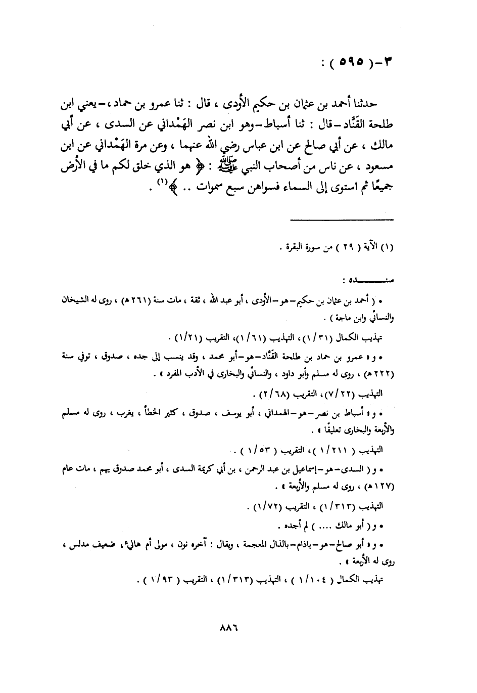 حَدَّثَنَا أَحْمَدُ بْنُ عُثْمَانَ بْنِ حَكِيمٍ الْأَوْدِيُّ، قَالَ: ثَنَا عَمْرُو بْنُ حَمَّادٍ، يَعْنِي ابْنَ طَلْحَةَ الْقَنَّادَ، قَالَ: ثَنَا أَسْبَاطُ، وَهُوَ ابْنُ نَصْرٍ الْهَمْدَانِيُّ، عَنِ السُّدِّيِّ، عَنْ أَبِي مَالِكٍ، عَنْ أَبِي صَالِحٍ، عَنِ ابْنِ عَبَّاسٍ، رَضِيَ اللَّهُ عَنْهُمَا، وَعَنْ مُرَّةَ الْهَمْدَانِيِّ، عَنِ ابْنِ مَسْعُودٍ، عَنْ نَاسٍ، مِنْ أَصْحَابِ النَّبِيِّ صَلَّى اللهُ عَلَيْهِ وَسَلَّمَ: {هُوَ الَّذِي خَلَقَ لَكُمْ مَا فِي الْأَرْضِ جَمِيعًا ثُمَّ اسْتَوَى إِلَى السَّمَاءِ فَسَوَّاهُنَّ سَبْعَ سَمَوَاتٍ} -[887]- قَالَ: " إِنَّ اللَّهَ تَبَارَكَ وَتَعَالَى §كَانَ عَرْشُهُ عَلَى الْمَاءِ، وَلَمْ يَخْلُقْ شَيْئًا غَيْرَ مَا خَلَقَ قَبْلَ الْمَاءِ، فَلَمَّا أَرَادَ أَنْ يَخْلُقَ الْخَلْقَ أَخْرَجَ مِنَ الْمَاءِ دُخَانًا فَارْتَفَعَ فَوْقَ الْمَاءِ فَسَمَا عَلَيْهِ فَسَمَّاهُ سَمَاءً، ثُمَّ أَيْبَسَ الْمَاءَ فَجَعَلَهُ أَرْضًا وَاحِدَةَ، ثُمَّ فَتَقَهَا فَجَعَلَهَا سَبْعَ أَرَاضِينَ فِي يَوْمَيْنِ فِي الْأَحَدِ وَالِاثْنَيْنِ فَخَلَقَ الْأَرْضَ عَلَى حُوتٍ، وَالْحُوتُ هُوَ النُّونُ الَّذِي ذَكَرَهُ اللَّهُ عَزَّ وَجَلَّ فِي الْقُرْآنِ بِقَوْلِهِ: {ن وَالْقَلَمِ} [القلم: 1] وَالْحُوتُ فِي الْمَاءِ، وَالْمَاءُ عَلَى ظَهْرِ صَفَاةٍ، وَالصَّفَاةُ عَلَى ظَهْرِ مَلَكٍ، وَالْمَلَكُ عَلَى الصَّخْرَةِ، وَالصَّخْرَةُ فِي الرِّيحِ، وَهِيَ الصَّخْرَةُ الَّتِي ذَكَرَ لُقْمَانُ لَيْسَتْ فِي السَّمَاءِ وَلَا فِي الْأَرْضِ، فَتَحَرَّكَ الْحُوتُ، فَاضْطَرَبَتْ، فَتَزَلْزَلَتْ الْأَرْضُ، فَأَرْسَى عَلَيْهَا الْجِبَالَ، فَقَرَّتْ، فَالْجِبَالُ تَفْخَرُ عَلَى الْأَرْضِ فَذَلِكَ قَوْلُهُ تَعَالَى: وَأَلْقَى فِي الْأَرْض ِ رَوَاسِيَ أَنْ تَمِيدَ بِكُمْ وَخَلَقَ الْجِبَالَ فِيهَا وَأَقْوَاتِ أَهْلِهَا وَشَجَرَهَا وَمَا يَنْبَغِي لَهَا فِي يَوْمَيْنِ، فِي الثُّلَاثَاءِ وَالْأَرْبِعَاءِ، فَذَلِكَ حِينَ يَقُولُ: {أَئِنَّكُمْ لَتَكْفُرُونَ بِالَّذِي خَلَقَ الْأَرْضَ فِي يَوْمَيْنِ وَتَجْعَلُونَ لَهُ أَنْدَادًا ذَلِكَ رَبُّ الْعَالَمِينَ وَجَعَلَ فِيهَا رَوَاسِيَ مِنْ فَوْقِهَا وَبَارَكَ فِيهَا} [فصلت: 9]