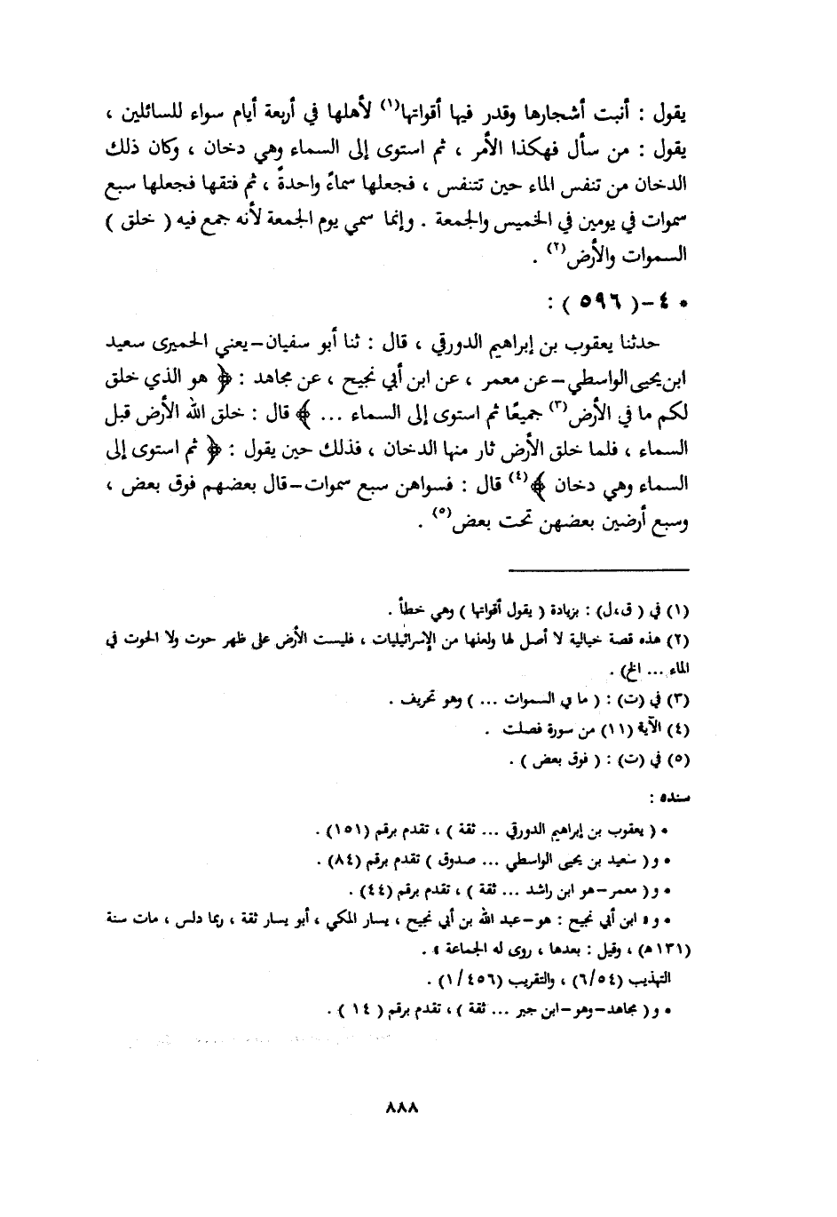 حَدَّثَنَا يَعْقُوبُ بْنُ إِبْرَاهِيمَ الدَّوْرَقِيُّ، قَالَ: ثَنَا أَبُو سُفْيَانَ يَعْنِي الْحِمْيَرِيَّ سَعِيدَ بْنَ يَحْيَى الْوَاسِطِيَّ، عَنْ مَعْمَرٍ، عَنِ ابْنِ أَبِي نَجِيحٍ، عَنْ مُجَاهِدٍ،: {هُوَ الَّذِي خَلَقَ لَكُمْ مَا فِي الْأَرْضِ جَمِيعًا ثُمَّ اسْتَوَى إِلَى السَّمَاءِ} [البقرة: 29] قَالَ: " §خَلَقَ اللَّهُ الْأَرْضَ قَبْلَ السَّمَاءِ، فَلَمَّا خَلَقَ الْأَرْضَ ثَارَ مِنْهَا الدُّخَانُ، فَذَلِكَ حِينَ يَقُولُ: {ثُمَّ اسْتَوَى إِلَى السَّمَاءِ وَهِيَ دُخَانٌ} [فصلت: 11] قَالَ: {فَسَوَّاهُنَّ سَبْعَ سَمَاوَاتٍ} [البقرة: 29] قَالَ بَعْضُهُمْ فَوْقَ بَعْضٍ، وَسَبْعَ أَرَضِينَ بَعْضُهُنَّ تَحْتَ بَعْضٍ "