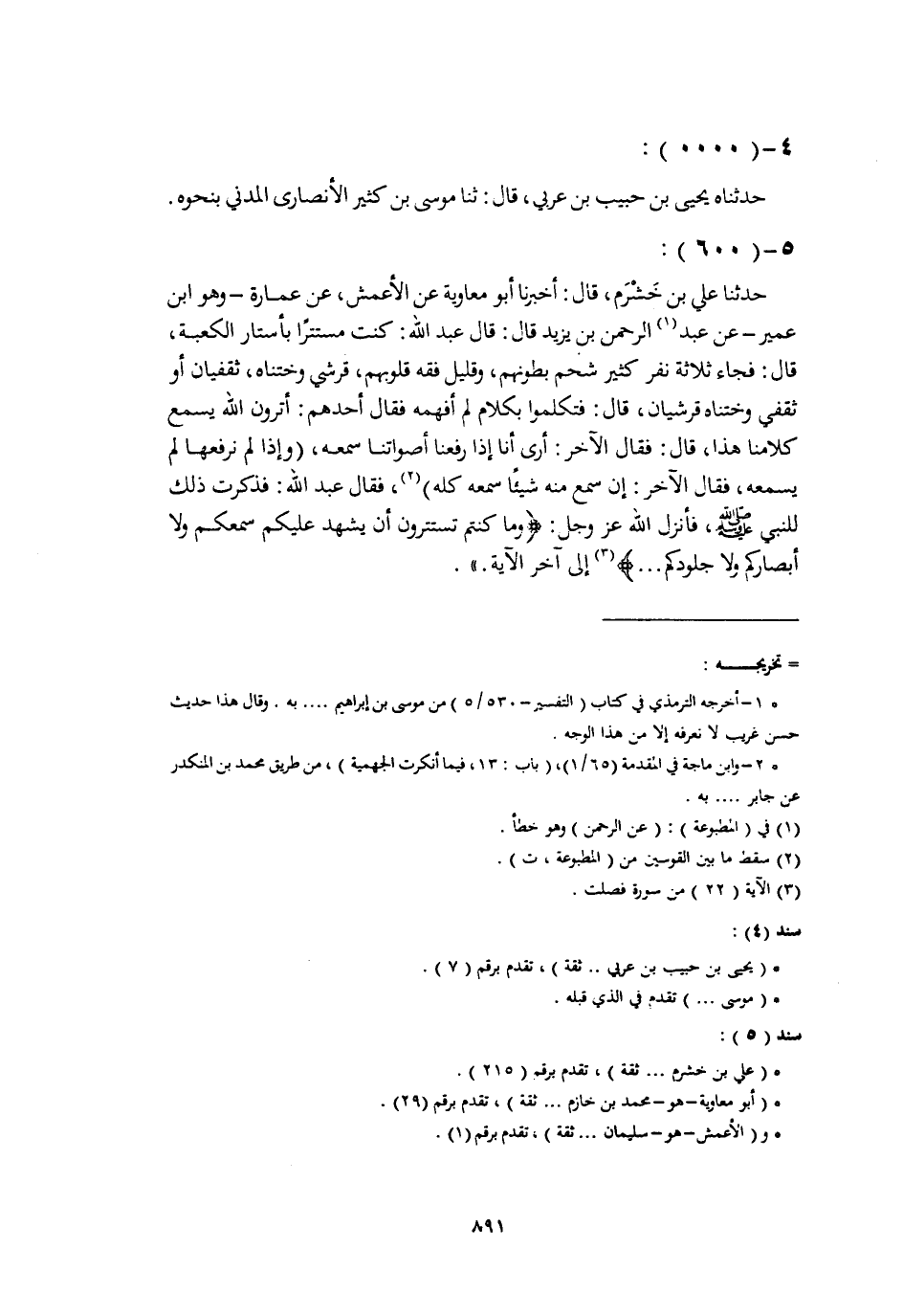 حَدَّثَنَا عَلِيُّ بْنُ خَشْرَمٍ، قَالَ: أَخْبَرَنَا أَبُو مُعَاوِيَةَ، عَنِ الْأَعْمَشِ، عَنْ عُمَارَةَ وَهُوَ ابْنُ عُمَيْرٍ، عَنْ عَبْدِ الرَّحْمَنِ بْنِ يَزِيدَ، قَالَ: قَالَ عَبْدُ اللَّهِ: كُنْتُ مُسْتَتِرًا بِأَسْتَارِ الْكَعْبَةِ، قَالَ: فَجَاءَ ثَلَاثَةُ نَفَرٍ كَثِيرٌ شَحْمُ بُطُونِهِمْ، وَقَلِيلٌ فِقْهُ قُلُوبِهِمْ، قُرَشِيٌّ وَخَتْنَاهُ، ثَقَفِيَّانِ أَوْ ثَقَفِيٌّ وَخَتْنَاهُ قُرَشِيَّانِ، قَالَ: " فَتَكَلَّمُوا بِكَلَامٍ لَمْ أَفْهَمْهُ فَقَالَ أَحَدُهُمْ: أَتَرَوْنَ اللَّهَ يَسْمَعُ كَلَامِنَا هَذَا، قَالَ: فَقَالَ الْآخَرُ: أَرَى أَنَّا إِذَا رَفَعْنَا أَصْوَاتَنَا سَمِعَهُ، وَإِذَا لَمْ نَرْفَعْهَا لَمْ يَسْمَعْهُ، فَقَالَ الْآخَرُ: إِنْ سَمِعَ مِنْهُ شَيْئًا سَمِعَهُ كُلَّهُ، فَقَالَ عَبْدُ اللَّهِ فَذَكَرْتُ ذَلِكَ لِلنَّبِيِّ صَلَّى اللهُ عَلَيْهِ وَسَلَّمَ، فَأَنْزَلَ اللَّهُ عَزَّ وَجَلَّ: {§وَمَا كُنْتُمْ تَسْتَتِرُونَ أَنْ يَشْهَدَ عَلَيْكُمْ سَمْعُكُمْ وَلَا أَبْصَارُكُمْ وَلَا جُلُودُكُمْ} [فصلت: 22] إِلَى آخِرِ الْآيَةِ " -[892]- قَالَ أَبُو بَكْرٍ: فِي خَبَرِ ابْنِ مَسْعُودٍ الَّذِي أَمْلَيْتُهُ فِي كِتَابِ الْجِهَادِ، فِي قَوْلِهِ: {وَلَا تَحْسَبَنَّ الَّذِينَ قُتِلُوا فِي سَبِيلِ اللَّهِ أَمْوَاتًا بَلْ أَحْيَاءٌ} [آل عمران: 169] فِي الْجَنَّةِ، فَيَطَّلِعُ إِلَيْهِمْ رَبُّكَ اطِّلَاعَةً، فَقَالَ: هَلْ تَشْتَهُونَ شَيْئًا فَأَزِيدُكُمُوهُ؟ وَكُلُّ مَنْ لَهُ فَهْمٌ بِلُغَةِ الْعَرَبِ يَعْلَمُ أَنَّ الِاطِّلَاعَ إِلَى الشَّيْءِ لَا يَكُونُ إِلَّا مِنْ أَعْلَى إِلَى أَسْفَلَ، وَلَوْ كَانَ كَمَا زَعَمَتِ الْجَهْمِيَّةُ أَنَّ اللَّهَ مَعَ الْإِنْسَانِ وَأَسْفَلَ مِنْهُ وَفِي الْأَرْضِ السَّابِعَةِ السُّفْلَى، كَمَا هُوَ فِي السَّمَاءِ السَّابِعَةِ الْعُلْيَا، لَمْ يَكُنْ لِقَوْلِهِ: «فَيَطَّلِعُ إِلَيْهِمْ رَبُّكَ اطِّلَاعَةً» مَعْنًى