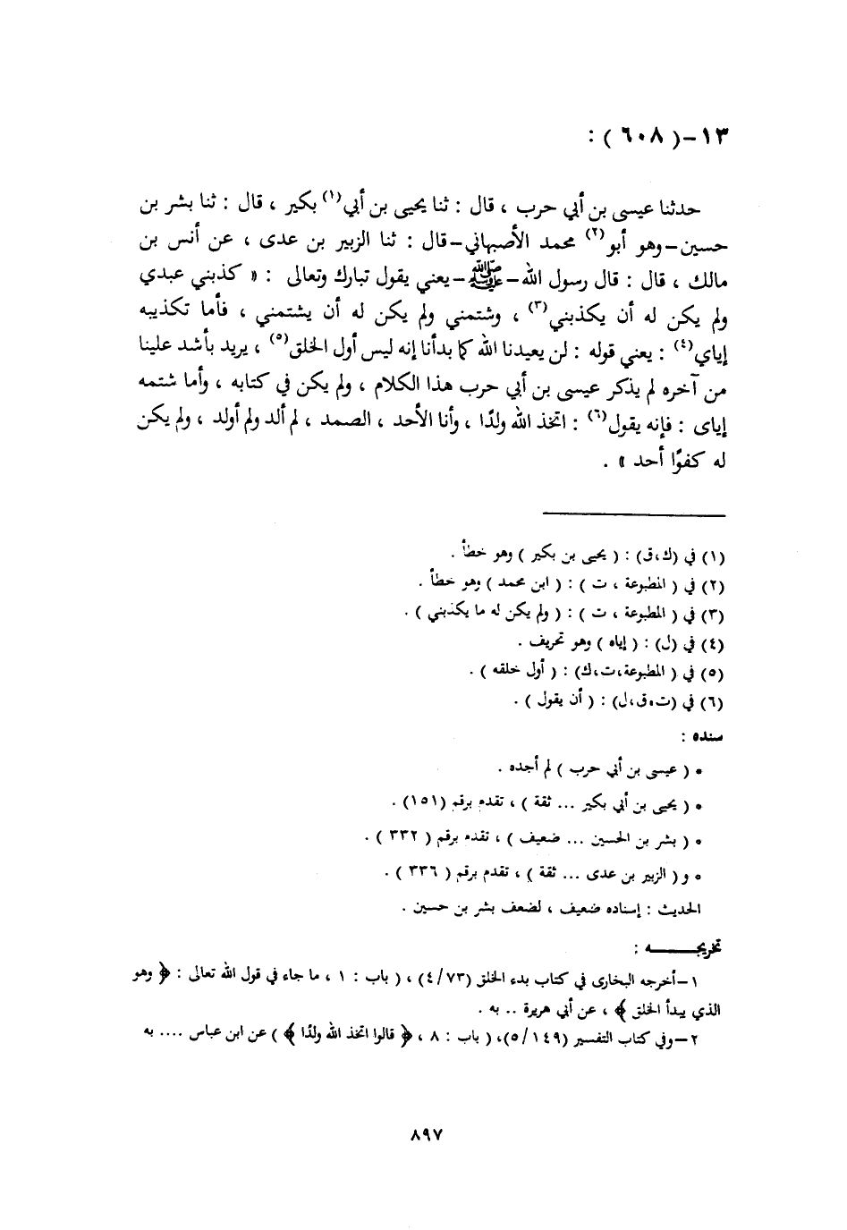 حَدَّثَنَا عِيسَى بْنُ أَبِي حَرْبٍ، قَالَ: ثَنَا يَحْيَى بْنُ أَبِي بُكَيْرٍ، قَالَ: ثَنَا بِشْرُ بْنُ حُسَيْنٍ، وَهُوَ أَبُو مُحَمَّدٍ الْأَصْبَهَانِيُّ قَالَ: ثَنَا الزُّبَيْرُ بْنُ عَدِيٍّ، عَنْ أَنَسِ بْنِ مَالِكٍ، قَالَ: قَالَ رَسُولُ اللَّهِ صَلَّى اللهُ عَلَيْهِ وَسَلَّمَ يَعْنِي يَقُولُ تَبَارَكَ وَتَعَالَى: " §كَذَّبَنِي عَبْدِي وَلَمْ يَكُنْ لَهُ أَنْ يُكَذِّبَنِي، وَشَتَمَنِي وَلَمْ يَكُنْ لَهُ أَنْ يَشْتُمَنِي، فَأَمَّا تَكْذِيبُهُ إِيَّايَ: يَعْنِي قَوْلَهُ: لَنْ يُعِيدَنَا اللَّهُ كَمَا بَدَأْنَا إِنَّهُ لَيْسَ أَوَّلُ الْخَلْقِ، يُرِيدُ بِأَشَدَّ عَلَيْنَا مِنْ آخِرِهِ «لَمْ يَذْكُرْ عِيسَى بْنُ أَبِي حَرْبٍ هَذَا الْكَلَامَ، وَلَمْ يَكُنْ فِي كِتَابِهِ،» وَأَمَّا شَتْمُهُ إِيَّايَ: فَإِنَّهُ يَقُولُ: اتَّخَذَ اللَّهُ وَلَدًا، وَأَنَا الْأَحَدُ، الصَّمَدُ، لَمْ أَلِدْ وَلَمْ أُولَدْ، وَلَمْ يَكُنْ لَهُ كُفُوًا أَحَدٌ "