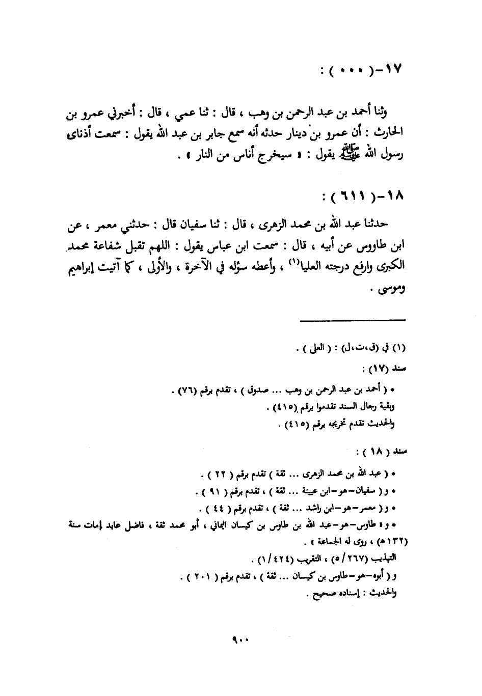 حَدَّثَنَا عَبْدُ اللَّهِ بْنُ مُحَمَّدٍ الزُّهْرِيُّ، قَالَ: ثَنَا سُفْيَانُ، قَالَ: حَدَّثَنِي مَعْمَرٌ، عَنِ ابْنِ طَاوُسٍ، عَنْ أَبِيهِ، قَالَ: سَمِعْتُ ابْنَ عَبَّاسٍ، يَقُولُ: «اللَّهُمَّ §تَقَبَّلْ شَفَاعَةَ مُحَمَّدٍ الْكُبْرَى وَارْفَعْ دَرَجَتَهُ الْعُلْيَا، وَأَعْطِهِ سُؤْلَهُ فِي الْآخِرَةِ وَالْأُولَى، كَمَا آتَيْتَ إِبْرَاهِيمَ وَمُوسَى»