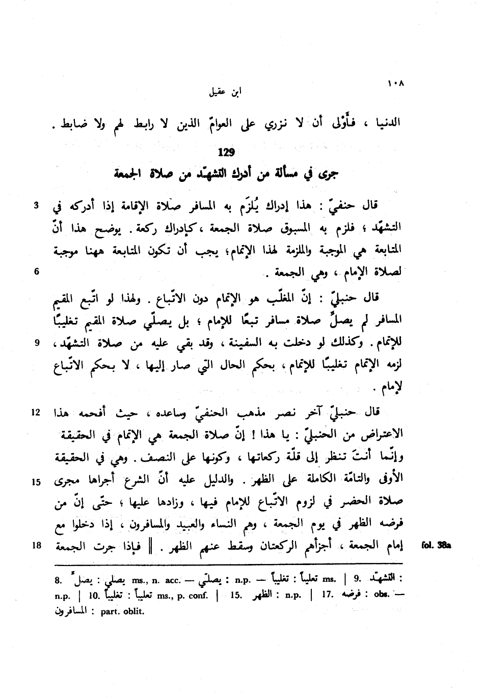 قال حنبلي آخر نصر مذهب الحنفي وساعده، حيث أفحمه هذا الاعتراض من الحنبلي: يا هذا! إن صلاة الجمعة هي الإتمام في الحقيقة وإنما أنت تنظر إلى قلة ركعاتها، وكونها على النصف. وهي في الحقيقة الأوفى والتامة الكاملة على الظهر. والدليل عليه أن الشرع أجراها مجرى صلاة الحضر في لزوم الإتباع للإمام فيها، وزادها عليها؛ حتى إن من فرضه الظهر في يوم الجمعة، وهم النساء والعبيد والمسافرون، إذا دخلوا مع إمام الجمعة، أجزأهم الركعتان وسقط عنهم الظهر. || فإذا جرت الجمعة