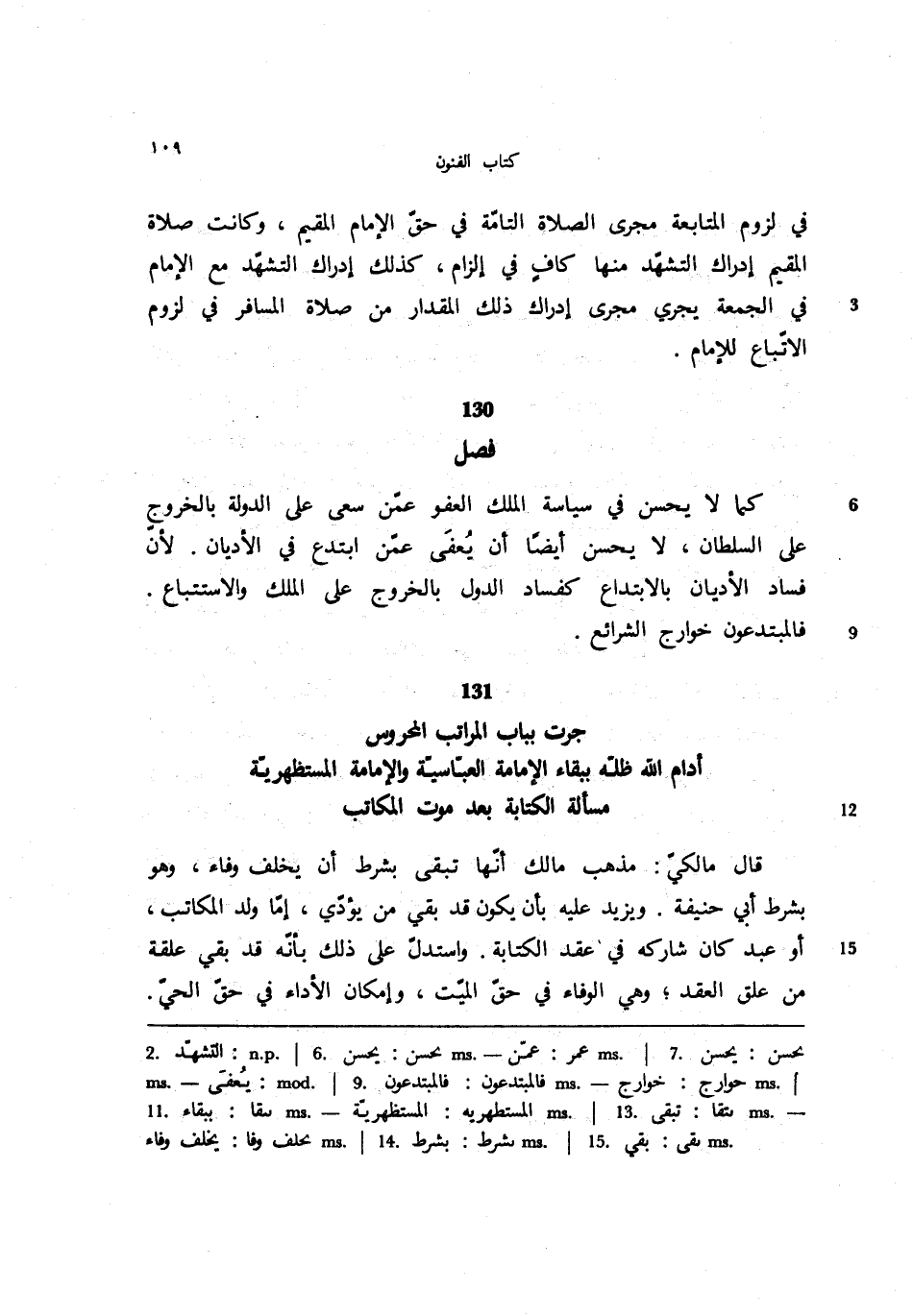 كما لا يحسن في سياسة الملك العفو عمن سعى على الدولة بالخروج على السلطان، لا يحسن أيضًا أن يعفى عمن ابتدع في الأديان. لأن فساد الأديان بالابتداع كفساد الدول بالخروج على الملك والاستتباع. فالمبتدعون خوارج الشرائع.