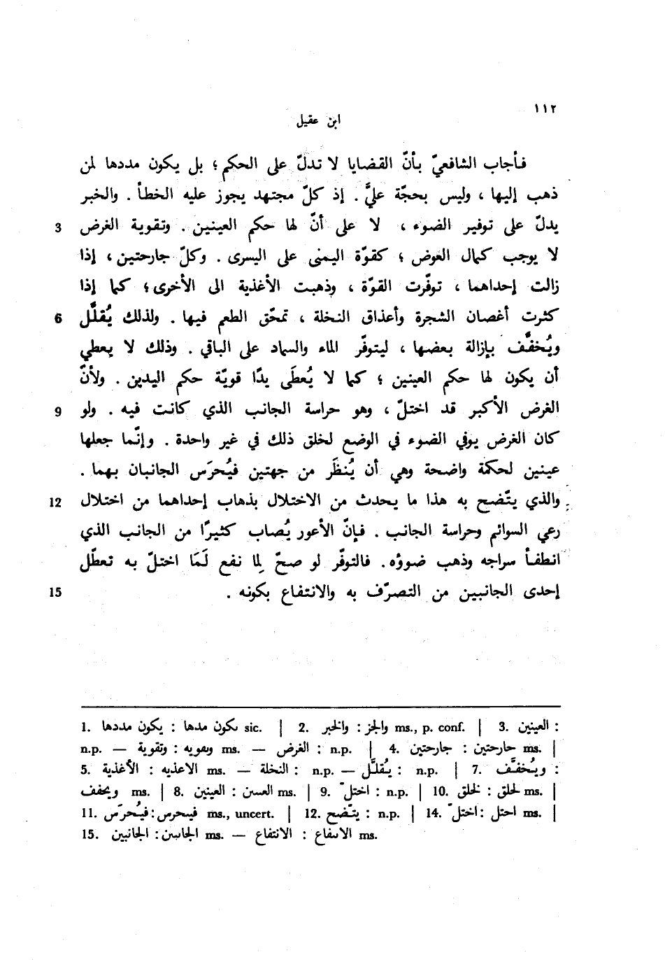 فأجاب الشافعي بأن القضايا لا تدل على الحكم؛ بل يكون مددها لمن ذهب إليها، وليس بحجة علي. إذ كل مجتهد يجوز عليه الخطأ. والخبر يدل على توفير الضوء، لا على أن لها حكم العينين. وتقوية الغرض لا يوجب كمال العوض؛ كقوة اليمنى على اليسرى. وكل جارحتين، إذا زالت إحداهما، توفرت القوة، وذهبت الأغذية إلى الأخرى؛ كما إذا كثرت أغصان الشجرة وأعذاق الشجرة وأعذاق النخلة، تمحق الطعم فيها. ولذلك يقلل ويخفف بإزالة بعضها، ليتوفر الماء والسماد على الباقي. وذلك لا يعطي أن يكون لها حكم العينين؛ كما لا يعطى يدًا قوية حكم اليدين. ولأن الغرض الأكبر قد اختل، وهو حراسة الجانب الذي كانت فيه. ولو كان الغرض يوفي الضوء في الوضع لخلق ذلك في غير واحدة. وإنما جعلها عينين لحكمة واضحة وهي أن ينظر من جهتين فيحرس الجانبان بهما. والذي يتضح به هذا ما يحدث من الاختلال بذهاب إحداهما من اختلال رعي السوائم وحراسة الجانب. فإن الأعور يصاب كثيرًا من الجانب الذي انطفأ سراجه وذهب ضوؤه. فالتوفر لو صح لما نفع لما اختل به تعطل إحدى الجانبين من التصرف به والانتفاع بكونه.