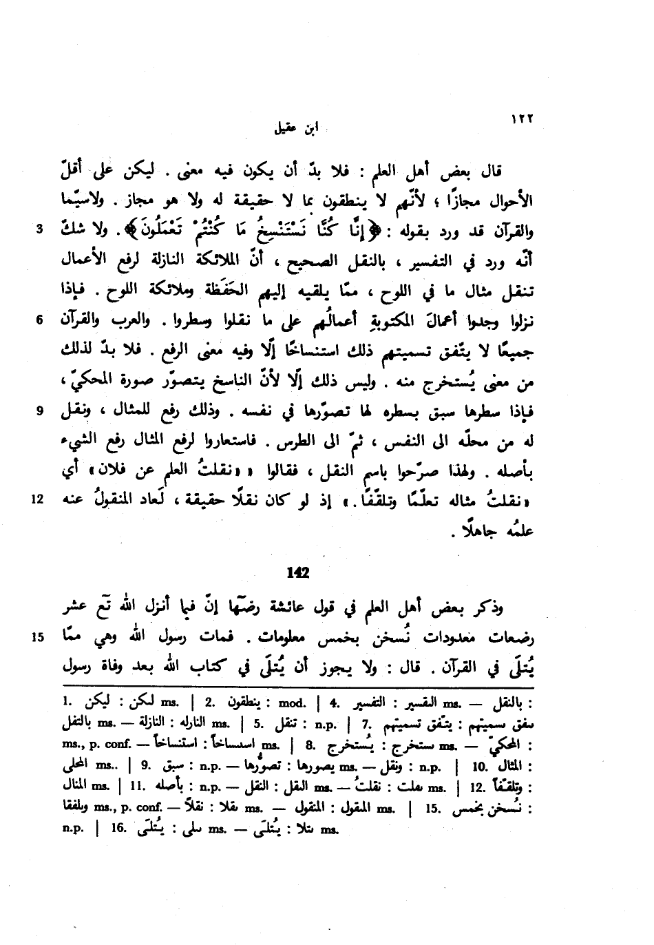 142 - وذكر بعض أهل العلم في قول عائشة رضها إن فيما أنزل الله تع عشر رضعات معدودات نسخن بخمس معلومات. فمات رسول الله وهي مما يتلى في القرآن. قال: ولا يجوز أن يتلى في كتاب الله بعد وفاة رسول