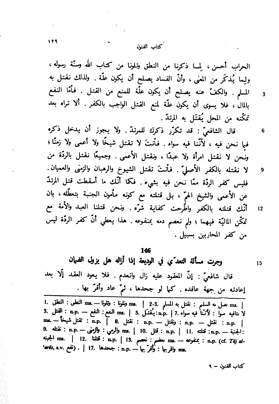 قال الشافعي: فقد تكرر: قد تكرر ذكرك للمرتد. ولا يجوز أن يدخل ذكره فيما نحن فيه، لأننا فيه سواء. فأنت لا تقتل شيخًا ولا أعمى ولا زمنا؛ ونحن لا نقتل امرأة ولا عبدًا، ونقتل الأعمى. وجميعا نقتل بالردة من لا نقتله بالكفر الأصلي. فأنت تقتل الشيوخ والرهبان والزمني والعميان. فليس كفر الردة مما نحن فيه بشيء. فكما أنك ما أسقطت قتل المرتد عن الأعمى والشيخ الهم، بل قتلته مع كونه مأمون الجنية بتعطله، بأن أنك قتلته بالكفر واطرحت كفاية شره. ونحن قتلنا العبد والأمة مع تمكن المالية فيهما؛ ولم تعصم دمه بمنقوعة. هذا يعطي أن كفر الردة ليس من كفر المحاربين بسبيل.