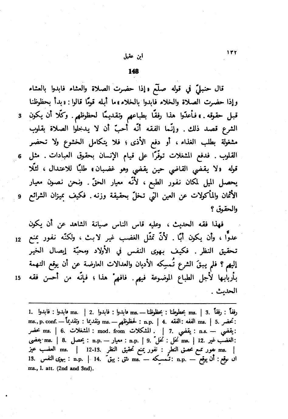 148 - قال حنبلي في قوله صلع ((إذا حضرت الصلاة والعشاء فابدوا بالعشاء وإذا حضرت الصلاة والخلاء فابدوا بالخلاء)) ما أبله قومًا قالوا: ((بدأ بحظوظنا قبل حقوقه.)) فأعدوا هذا رفقًا بطباعهم وتقديمًا لحظوظهم. وكلا أن يكون الشرع قصد ذلك. وإنما الفقه أنه أحب أن لا يدخلوا الصلاة بقلوب مشغولة بطلب الغذاء، أو دفع الأذى؛ فلا يتكامل الخشوع ولا تحضر القلوب. فدفع المشغلات توفرًا على قيام الإنسان بحقوق العبادات. مثل قوله ((لا يقضي القاضي حين يقضي وهو غضبان)) طلبًا للاعتدال، لئلا يحصل الميل لمكان نفور الطبع، لأنه معيار الحق. ونحن نصون معيار الأثمان والمأكولات عن العين التي تخل بحقيقة وزنه. فكيف بميزان الشرائع والحقوق؟