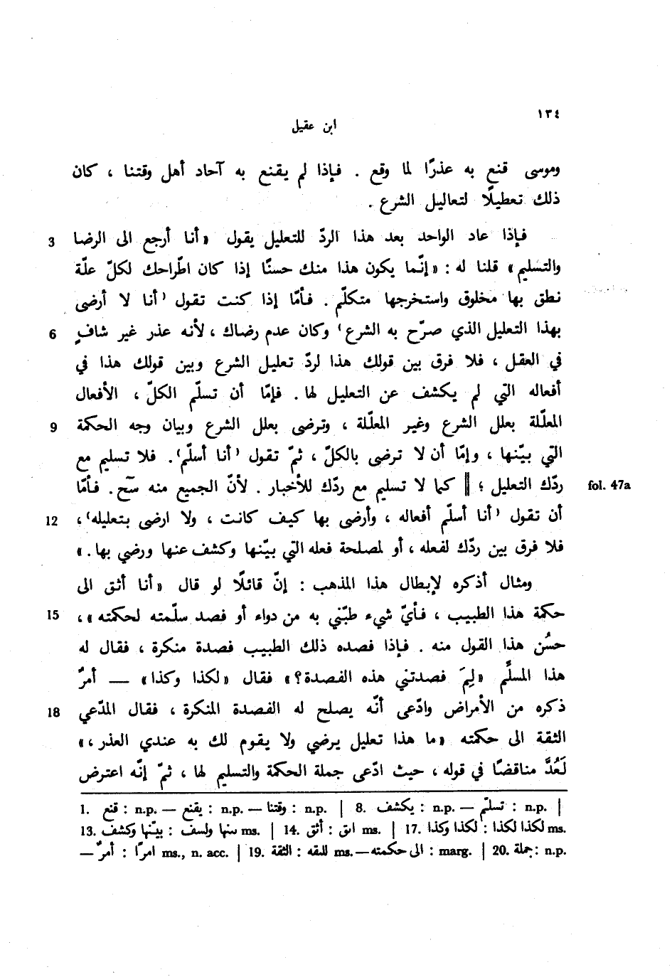 فإذا عاد الواحد بعد هذا الرد للتعليل يقول ((أنا أرجع إلى الرضا والتسليم)) قلنا له: ((إنما يكون هذا منك حسنًا إذا كان اطراحك لكل علة نطق بها مخلوق واستخرجها متكلم. فأما إذا كنت تقول ((أنا لا أرضى بهذا التعليل الذي صرح به الشرع)) وكان عدم رضاك، لأنه عذر غير شاف في العقل، فلا فرق بين قولك هذا لرد تعليل الشرع وبين قولك هذا في أفعاله التي لم يكشف عن التعليل لها. فإما أن تسلم الكل، الأفعال المعللة بعلل الشرع وغير المعللة، وترضي بعلل الشرع وبيان وجه الحكمة التي بينها، وإما أن لا ترضي بالكل، ثم تقول (أنا أسلم). فلا تسليم مع ردك التعليل؛ || كما لا تسليم مع ردك للأخبار. لأن الجميع منه سح. فأما أن تقول (أنا أسلم أفعاله، وأرضي بها كيف كانت، ولا أرضي بتعليله)، فلا فرق بين ردك لفعله، أو لمصلحة فعله التي بينها وكشف عنها ورضي بها.))