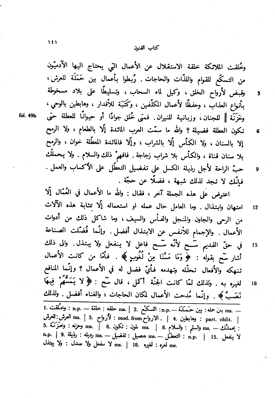 اعترض على هذه الجملة آخر، فقال: والله ما الأعمال في العمال إلا امتهان وابتذال. وما العامل حال عمله أو استعماله إلا بمثابة هذه الآلات من الرحى والجاون والمنجل والفأس والسيف، وما شاكل ذلك من أدوات الأعمال. والإجمام للأنفس عن الابتذال أفضل. وإنما فضلت الصناعة في حق القديم سح لأنه سح فاعل لا ينفعل ولا يبتذل. وإلى ذلك أشار سح بقوله: {وما مسنا من لغوب}. فأما من كانت الأعمال تنهكه والأفعال تحلله وتهدمه فأي فضل له في الأعمال؟ وإنما المنافع لغيره به. ولذلك لما كانت الجنة أكمل، قال سح: {لا يمسهم فيها نصب}. وإنما مدحت الأعمال لمكان الحاجات؛ والغناء أفضل. ولذلك