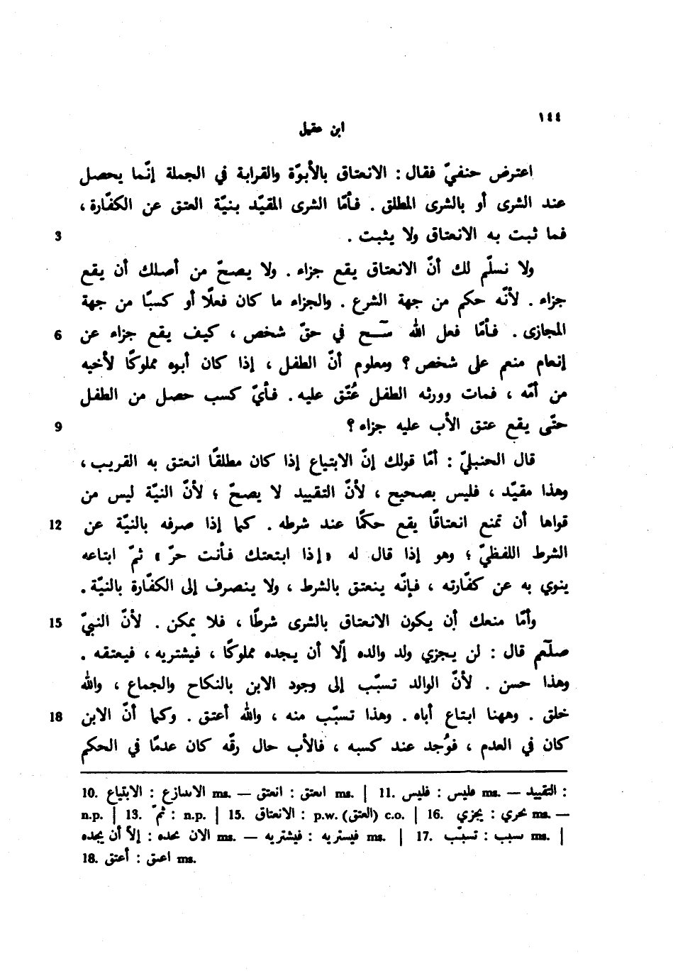 وأما منعك أن يكون الانعتاق بالشرى شرطًا، فلا يمكن. لأن النبي صلعم قال: لن يجزي ولد والده إلا أن يجده مملوكًا، فيشتريه، فيعتقه. وهذا حسن. لأن الوالد تسبب إلى وجود الابن بالنكاح والجماع، والله خلق. وههنا ابتاع أباه. وهذا تسبب منه، والله أعتق. وكما أن الابن كان في العدم، فوجد عند كسبه، فالأب حال رقه كان عدمًا في الحكم