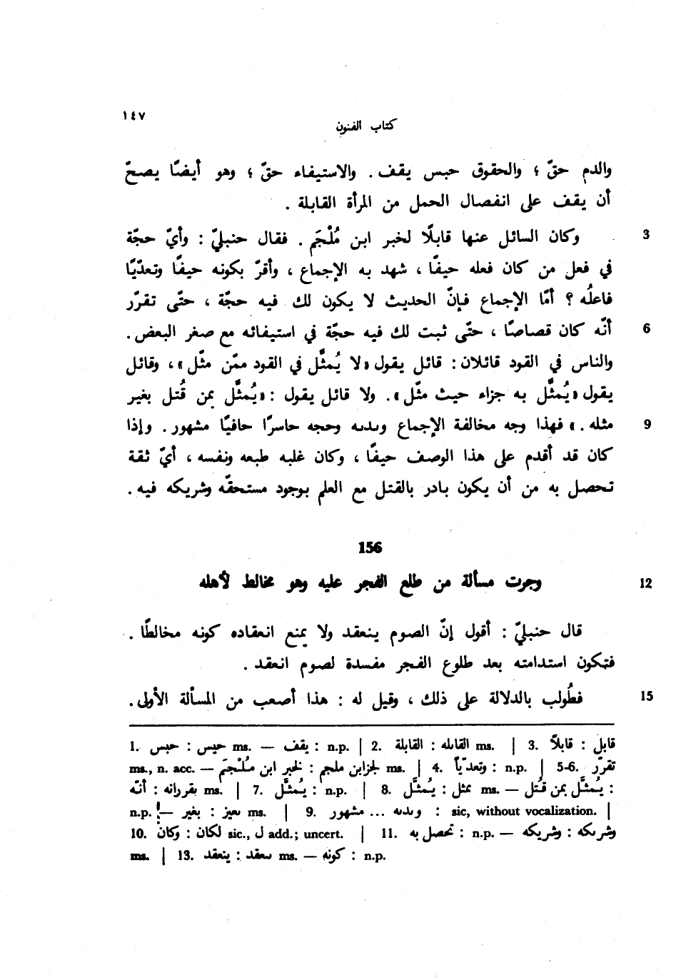 وكان السائل عنها قابلًا لخبر ابن ملجم. فقال حنبلي: وأي حجة في فعل من كان فعله حيفًا، شهد به الإجماع، وأقر بكونه حيفًا وتعديًا فاعله؟ أما الإجماع فإن الحديث لا يكون لك فيه حجة، حتى تقرر أنه كان قصاصًا، حتى ثبت لك فيه حجة في استيفائه مع صغر البعض. والناس في القود قائلان: قائل يقول ((لا يمثل في القود ممن مثل))، وقائل يقول ((يمثل يه جزاء حيث مثل)). ولا قائل يقول: ((يمثل بمن قتل بغير مثله.)) فهذا وجه مخالفة الإجماع ويديه وحجه حاسرًا حافيًا مشهور. وإذا كان قد أقدم على هذا الوصف حيفًا، وكان غلبه طبعه ونفسه، أي ثقة تحصل به من أن يكون بادر بالقتل مع العلم بوجود مستحقه وشريكه فيه.