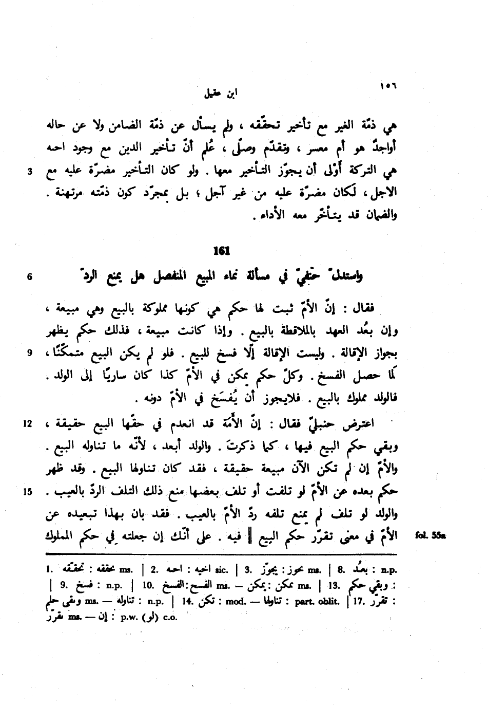 اعترض الحنبلي فقال: إن الأمة قد انعدم في حقها البيع حقيقة، وبقي حكم البيع فيها، كما ذكرت. والولد أبعد، لأنه ما تناوله البيع. والأم إن لم تكن الآن مبيعة حقيقة، فقد كان تناولها البيع. وقد ظهر حكم بعده عن الأم لو تلفت أو تلف بعضها منع ذلك التلف الرد بالعيب. والولد لو تلف لم يمنع تلفه رد الأم بالعيب. فقد بان بهذا تبعيده عن الأم في معنى تقرر حكم البيع || فيه. على أنك إن جعلته في حكم المملوك