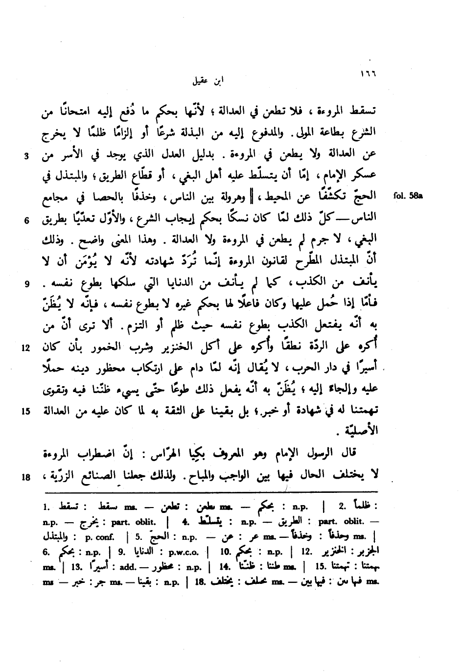 تسقط المروءة، فلا تطعن في العدالة؛ لأنها بحكم ما دفع إليه امتحانًا من الشرع بطاعة المولى. والدفوع إليه من البذلة شرعًا أو إلزامًا ظلمًا لا يخرج عن العدالة ولا يطعن في المروءة. بدليل العدل الذي يوجد في الأسر من عسكر الإمام، إما أن يتسلط عليه أهل البغي، أو قطاع الطريق؛ والمبتذل في الحج تكشفًا عن المحيط، || وهرولة بين الناس، وخذفًا بالحصار في مجامع الناس- كل ذلك لما كان نسكًا بحكم إيجاب الشرع، والأول تعديًا بطريق البغي، لا جرم لم يطعن في المروءة ولا العدالة. وهذا المعنى واضح. وذلك أن المبتذل المطرح لقانون المروءة إنما ترد شهادته لأنه لا يؤمن أن لا يأنف من الكذب، كما لم يأنف من الدنايا التي سلكها بطوع نفسه. فأما إذا حمل عليها وكان فاعلًا لها بحكم غيره لا بطوع نفسه، فإنه لا يظن به أنه يفتعل الكذب بطوع نفسه حيث ظلم أو التزم. ألا ترى أن من أكره على الردة نطقًا وأكره على أكل الخنزير وشرب الخمور بأن كان أسيرًا في دار الحرب، لا يقال إنه لما دام على ارتكاب محظور دينه حملًا عليه وإلجاءً إليه، يظن به أنه يفعل ذلك طوعًا حتى يسيء ظننا فيه وتقوى تهمتنا له في شهادة أو خبر؛ بل بقينا على الثقة به لما كان عليه من العدالة الأصلية.