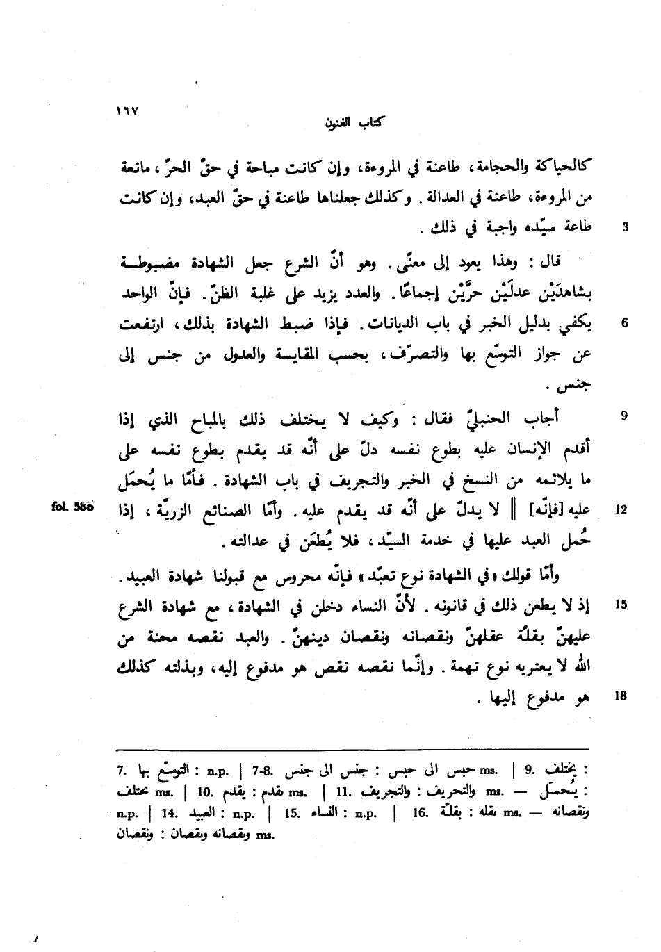 وأما قولك ((في الشهادة نوع تعبد)) فإنه محروس مع قبولنا شهادة العبيد. إذ لا يطعن ذلك في قانونه. لأن النساء دخلن في الشهادة، مع شهادة الشرع عليهن بقلة عقلهن ونقصانه ونقصان دينهن. والعبد نقصه محنة من الله لا يعتريه نوع تهمة. وإنما نقصه نقص هو مدفوع إليه، وبذلته كذلك هو مدفوع إليها.