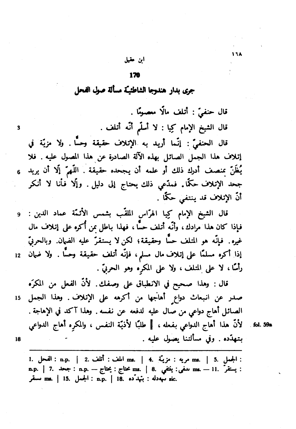 قال الحنفي: إنما أريد به الإتلاف حقيقة وحسًا. ولا مزية في إتلاف هذا الجمل الصائل بهذه الآلة الصادرة عن هذا المصول عليه. فلا يظن بمنصف أدرك ذلك أو علمه أن يجحده حقيقة. اللهم إلا أن يريد جحد الإتلاف حكمًا. فمدعي ذلك يحتاج إلى دليل. وإلا فأنا لا أنكر أن الإتلاف قد ينتفي حكمًا.