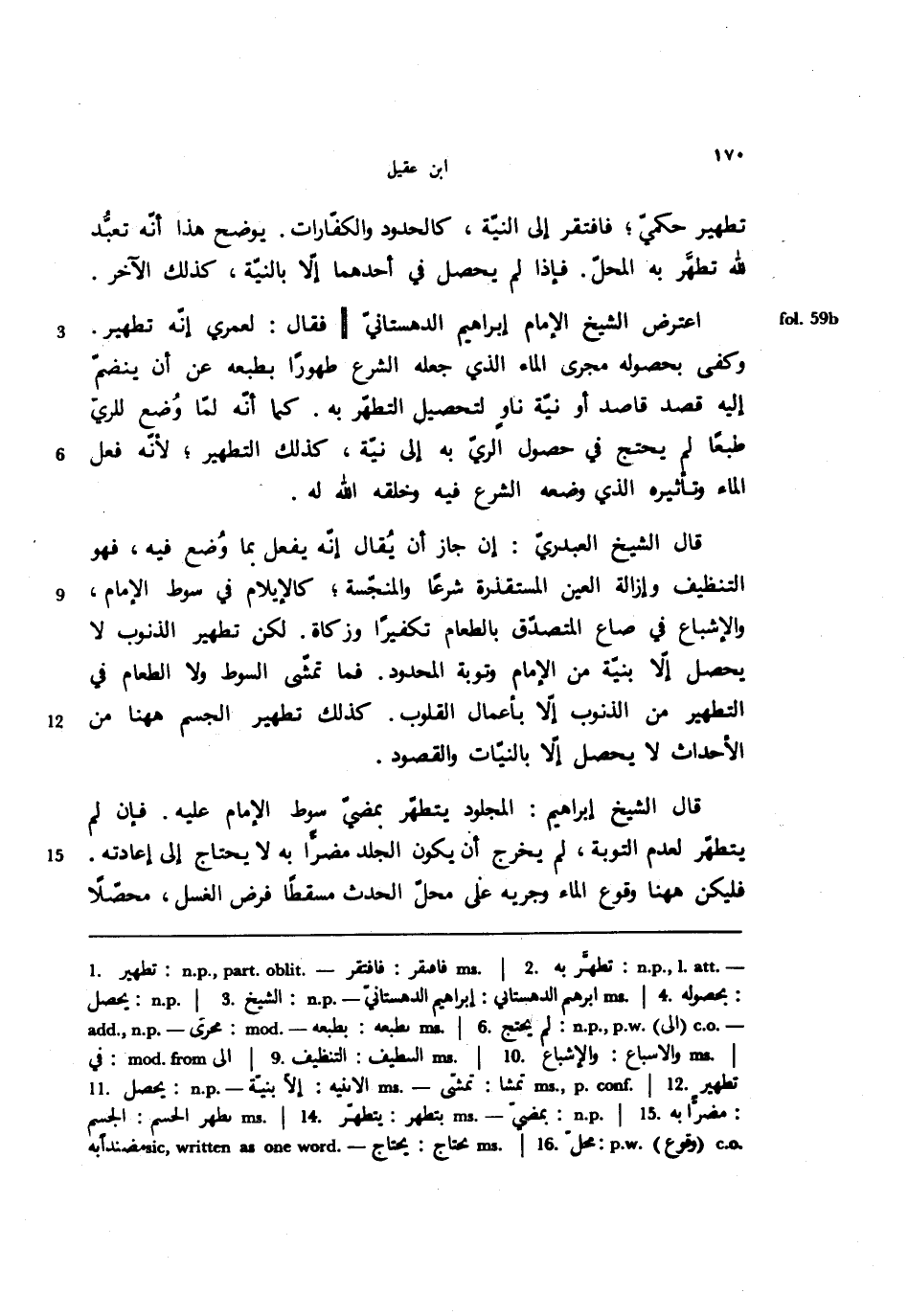اعترض الشيخ الإمام إبراهيم الدهستاني || فقال: لعمري إنه تطهير. وكفي بحصوله مجرى الماء الذي جعله الشرع طهورًا بطبعه عن أن ينضم إليه قصد قاصد أو نية ناو لتحصيل التطهر به. كما أنه لما وضع للري طبعًا لم يحتج في حصول الري به إلى نية، كذلك التطهير؛ لأنه فعل الماء وتأثيره الذي وضعه الشرع فيه وخلقه الله له.