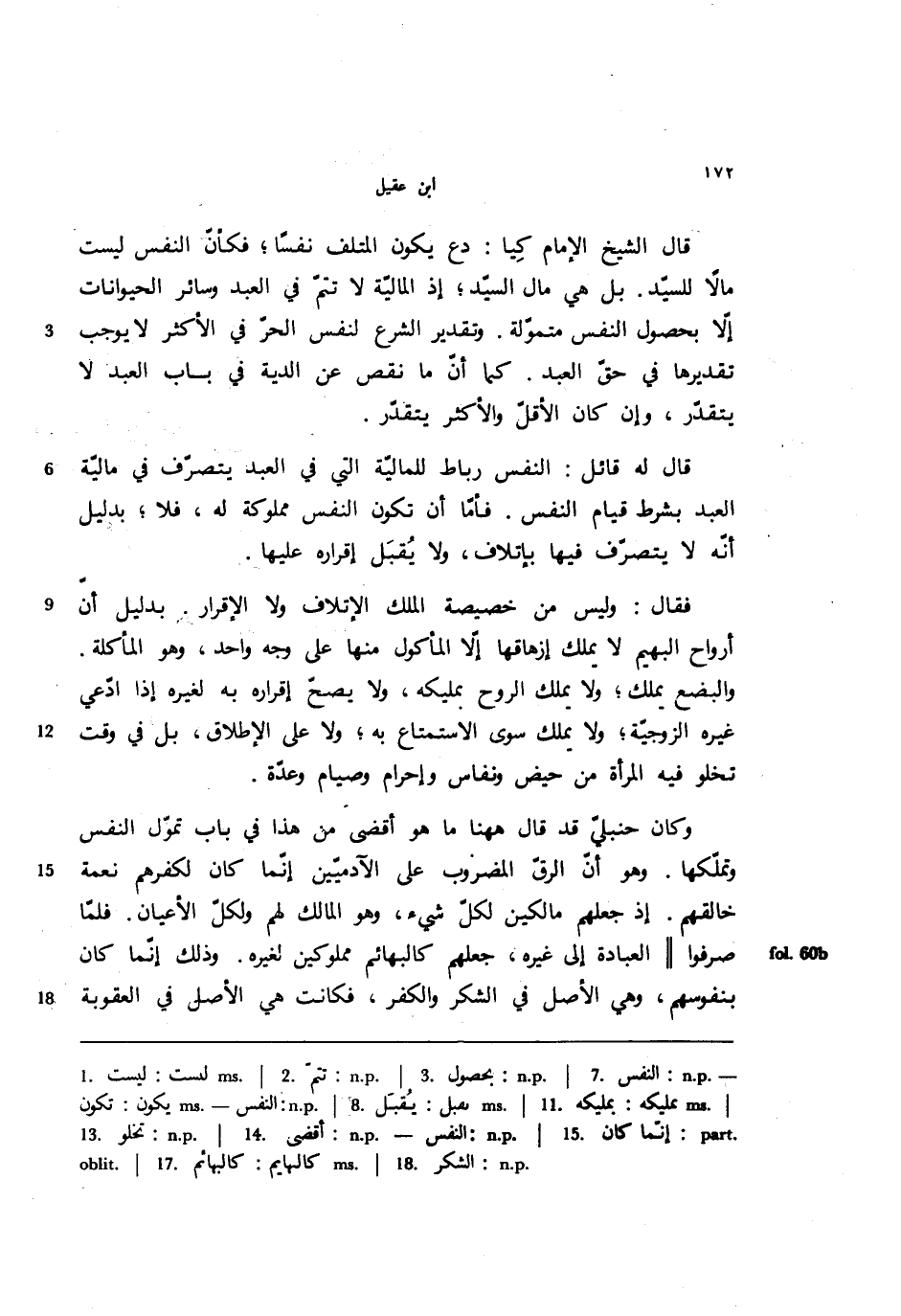 وكان حنبلي قد قال ههنا ما هو أقضى من هذا في باب تمول النفس وتملكها. وهو أن الرق المضروب على الآدميين إنما كان لكفرهم نعمة خالقهم. إذ جعلهم مالكين لكل شيء، وهو المالك لهم ولكل الأعيان. فلما صرفوا || العبادة إلى غيره، جعلهم كالبهائم مملوكين لغيره. وذلك إنما كان بنفوسهم، وهي الأصل في الشكر والكفر، فكانت هي الأصل في العقوبة