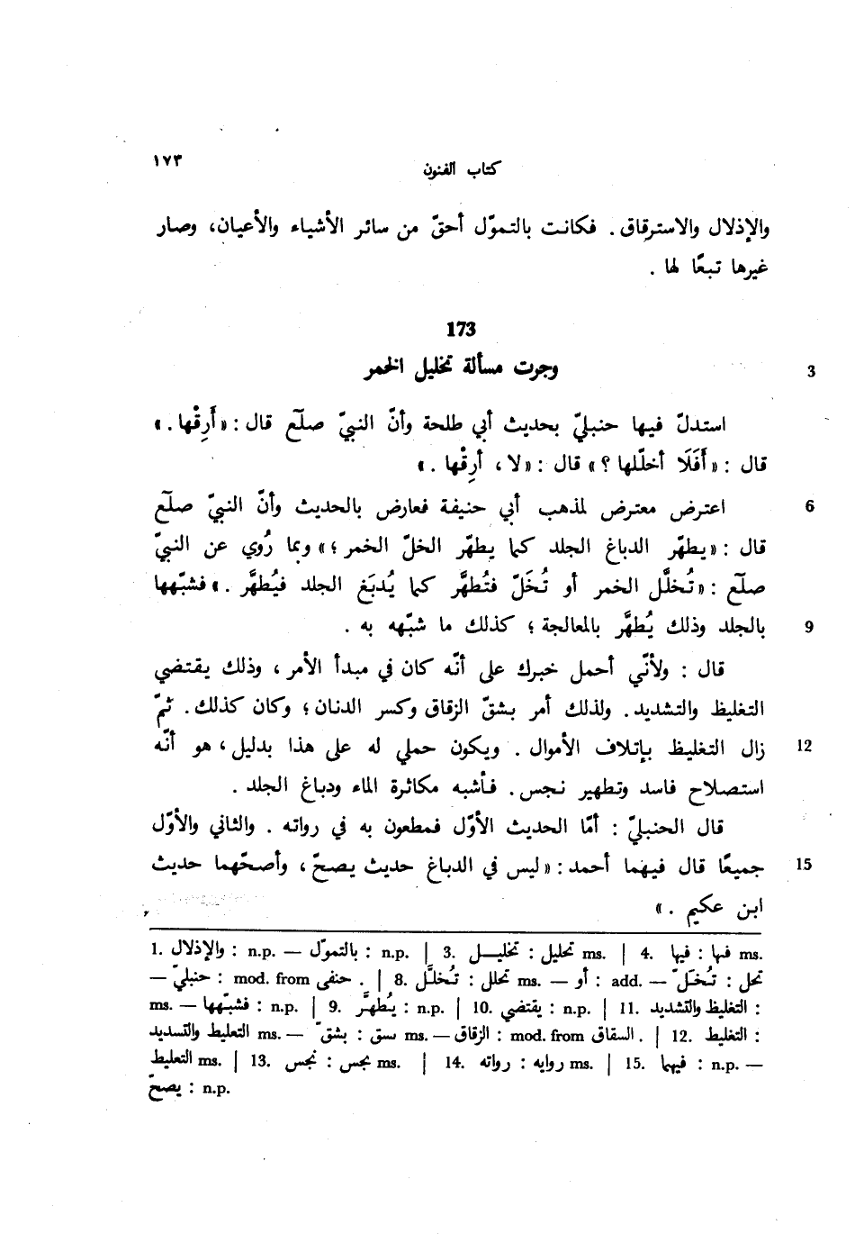 اعترض معترض لمذهب أبي حنيفة فعارض بالحديث وأن النبي صلع قال: ((يطهر الدباغ الجلد كما يطهر الخل الخمر؛ )) وبما روي عن النبي صلع: ((تخلل الخمر أو تخل فتطهر كما يدبغ الجلد فيطهر.)) فشبهها بالجلد وذلك يطهر بالمعالجة؛ كذلك ما شبهه به.