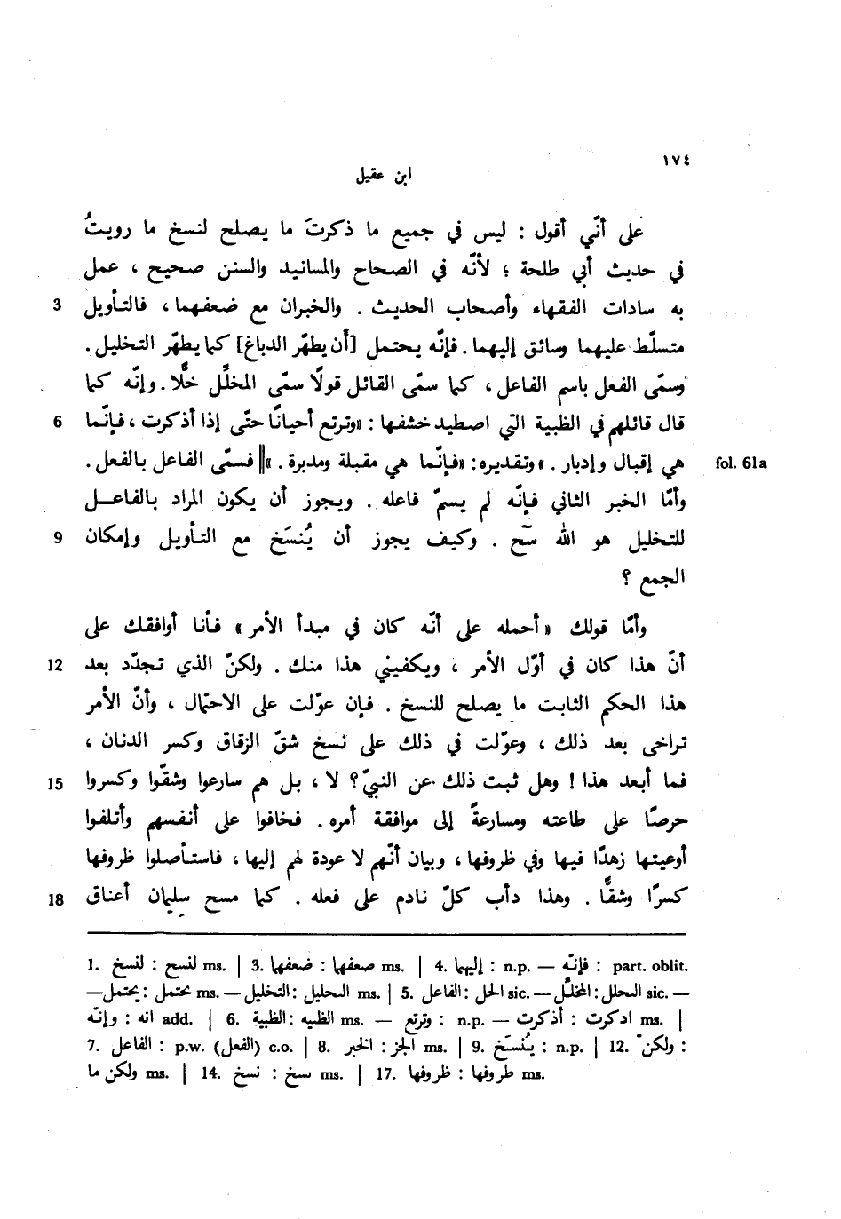 على أني أقول: ليس في جميع ما ذكرت ما يصلح لنسخ ما رويت في حديث أبي طلحة؛ لأنه في الصحاح والمسانيد والسنن صحيح، عمل به سادات الفقهاء وأصحاب الحديث. والخبران مع ضعفهما، فالتأويل متسلط عليهما وسائق إليهما. فإنه يحتمل [أن يطهر الدباغ] كما يطهر التخليل. وسمي الفعل باسم الفاعل، كما سمى القائل قوًا سمى المخلل خلا. وإنه كما قال قائلهم في الظبية التي اصطيد خشفها: ((وترتع أحيانًا حتى إذا أذكرت، فإنما هي إقبال وإدبار.)) وتقديره: ((فإنما هي مقبلة ومدبرة.)) || فسمى الفاعل بالفعل. وأما الخبر الثاني فإنه لم يسم فاعله. ويجوز أن يكون المراد بالفاعل للتخليل هو الله سح. وكيف يجوز أن ينسخ مع التأويل وإمكان الجمع؟