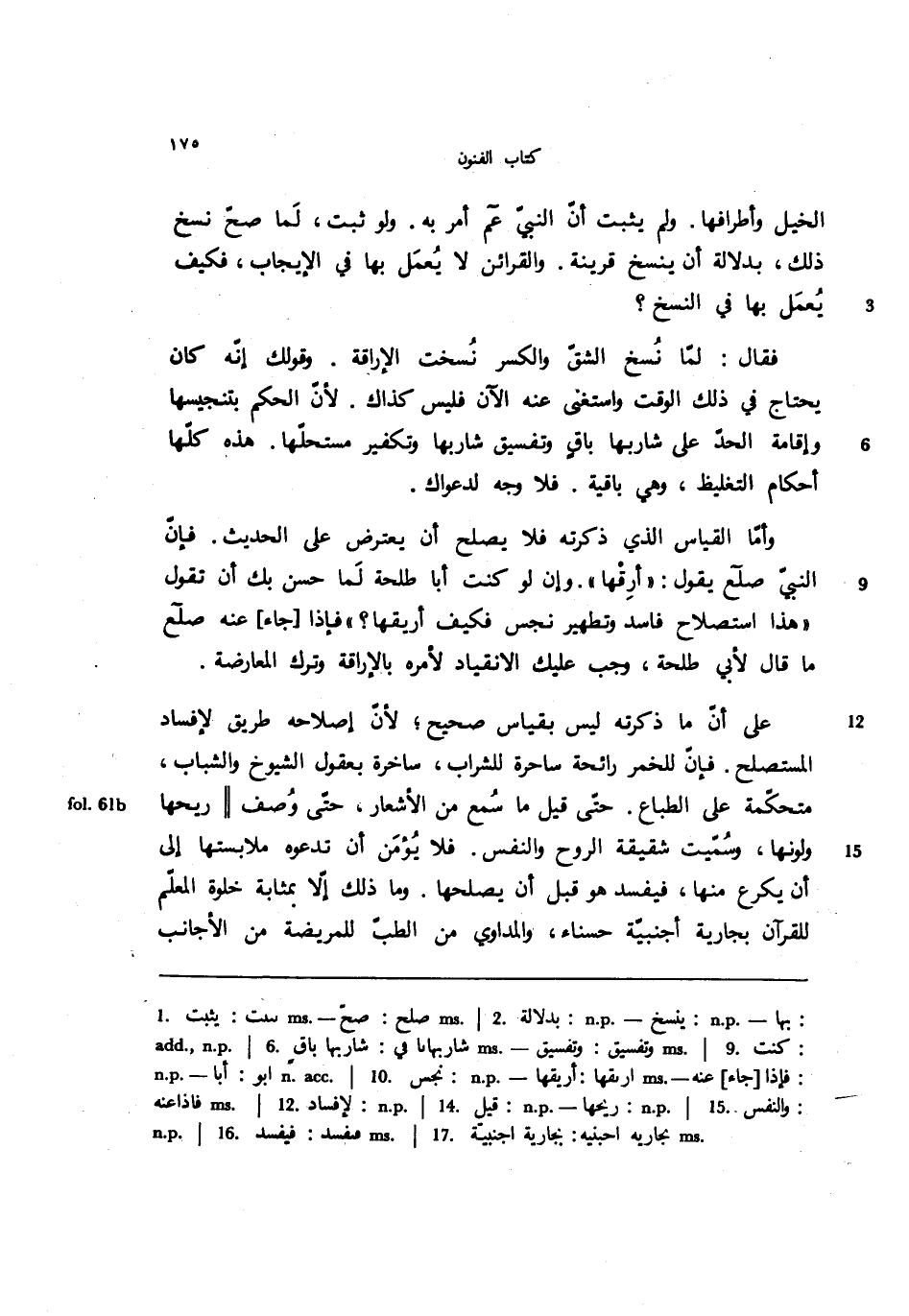 وأما القياس الذي ذكرته فلا يصلح أن يعترض على الحديث. فإن النبي صلع يقول: ((أرقها)). وإن لو كنت أبا طلحة لما حسن بك أن تقول ((هذا استصلاح فاسد وتطهير نجس فيكف أريقها؟ )) فإذا [جاء] عنه صلع ما قال لأبي طلحة، وجب عليك الانقياد بالإراقة وترك المعارضة.